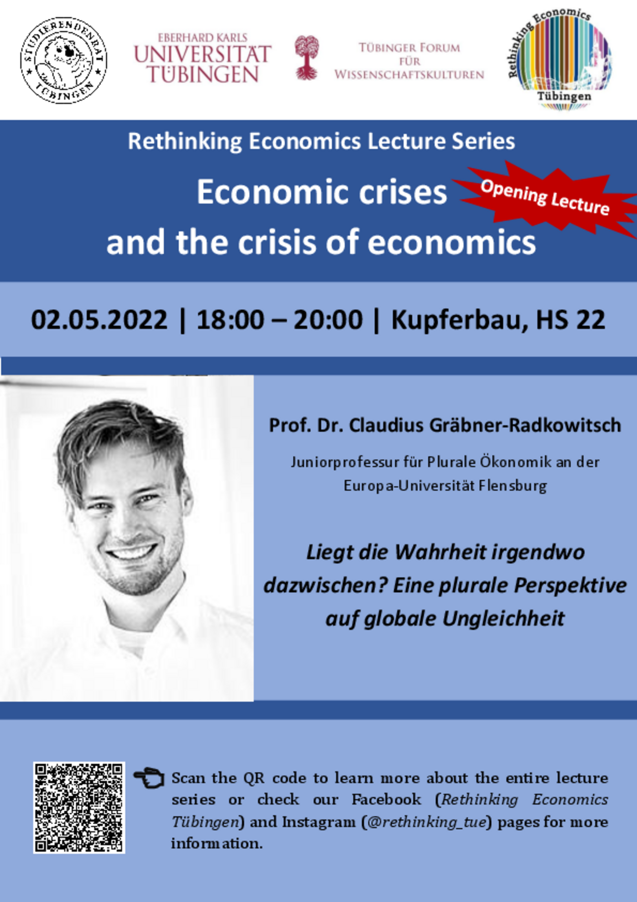 Auf Einladung von Rethinking Economics Tübingen hat Claudius Gräbner-Radkowitsch die Eröffnungsvorlesung der öffentlichen Ringvorlesung "Economics crises and the crisis of economics" in Tübingen gehalten. Der Titel des Vortrags lautete "Liegt die Wahrheit irgendwo dazwischen? Eine plurale Perspektive auf globale Ungleichheit" und die entsprechende Präsentation ist unter diesem Link verfügbar.