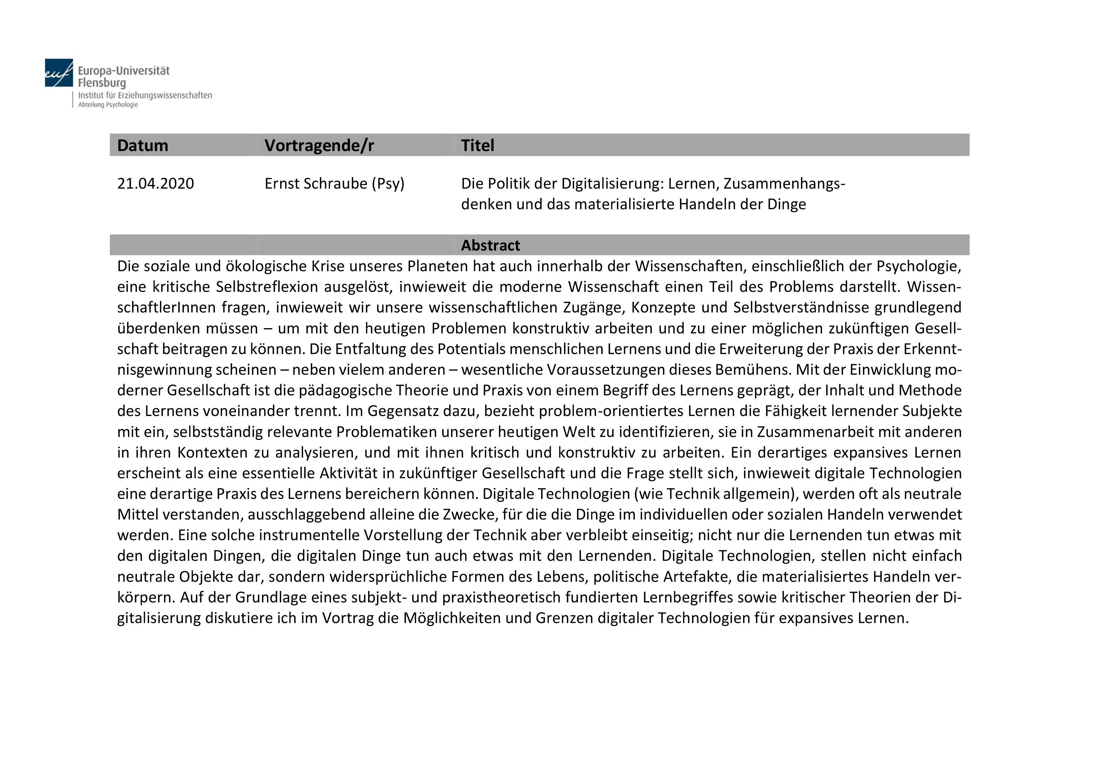 21.04.2020Ernst Schraube (Psy)Die Politik der Digitalisierung: Lernen, Zusammenhangsdenken und das materialisierte Handeln der DingeAbstract