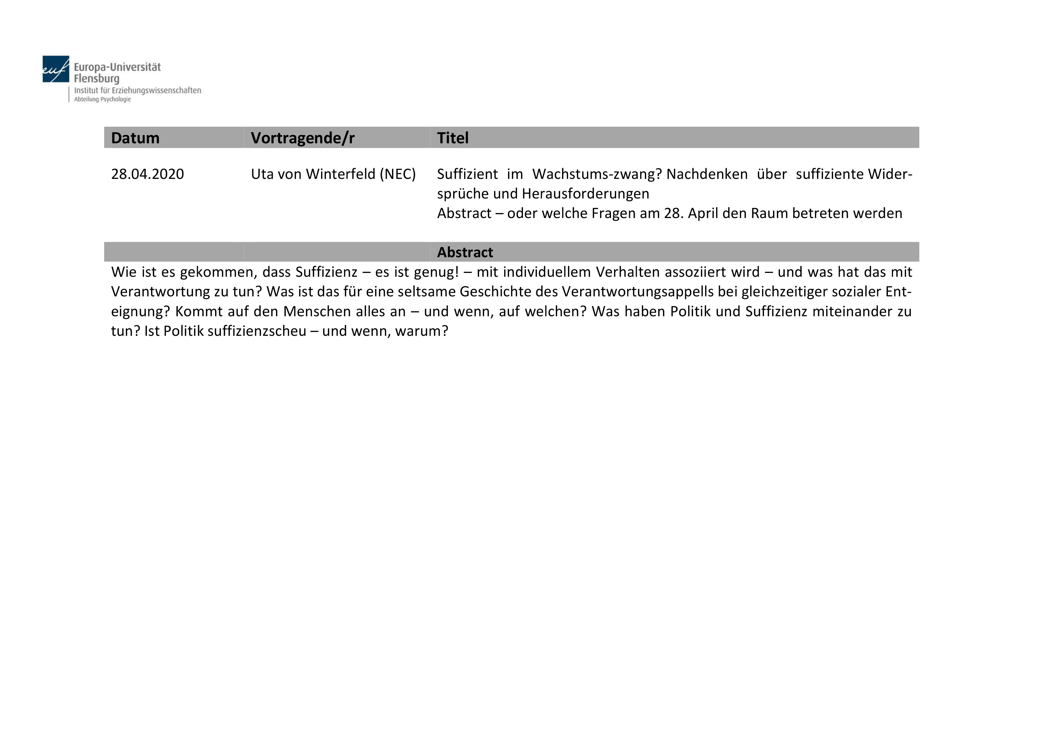 28.04.2020Uta von Winterfeld (NEC)Suffizient im Wachstumszwang? Nachdenken über suffiziente Widersprüche und HerausforderungenAbstract