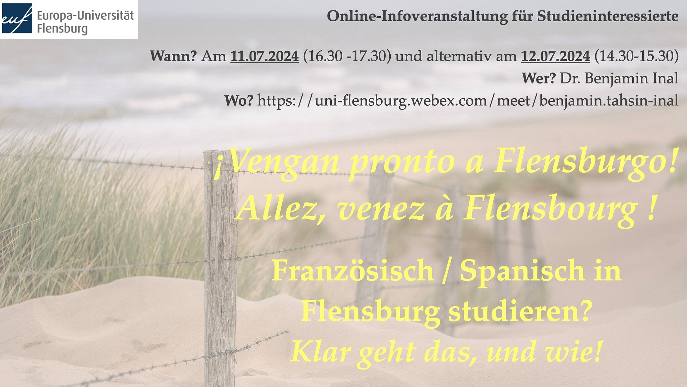Am 11.07.2024 findet von 16:30-17:30 Uhr eine Online-Infoveranstaltung für die Teilstudiengänge Französisch und Spanisch statt. Diese Veranstaltung wird auch zusätzlich am 12.07.2024 von 14:30-15:30 Uhr angeboten.