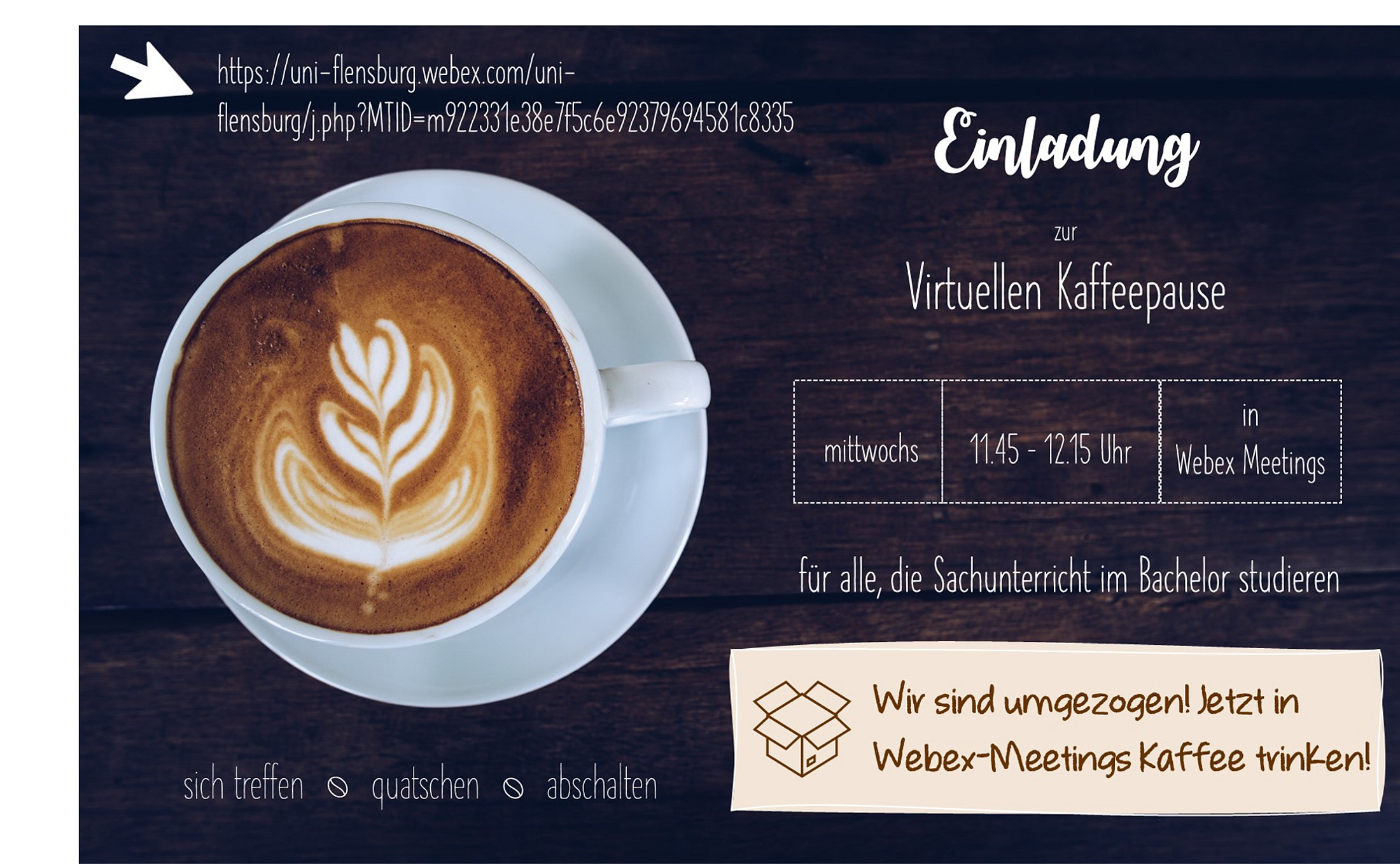 Jeden Mittwoch öffnet unser virtuelles Café in Webex-Meetings. Jeder, der im Bachelor Sachunterricht studiert, ist herzlich willkommen.