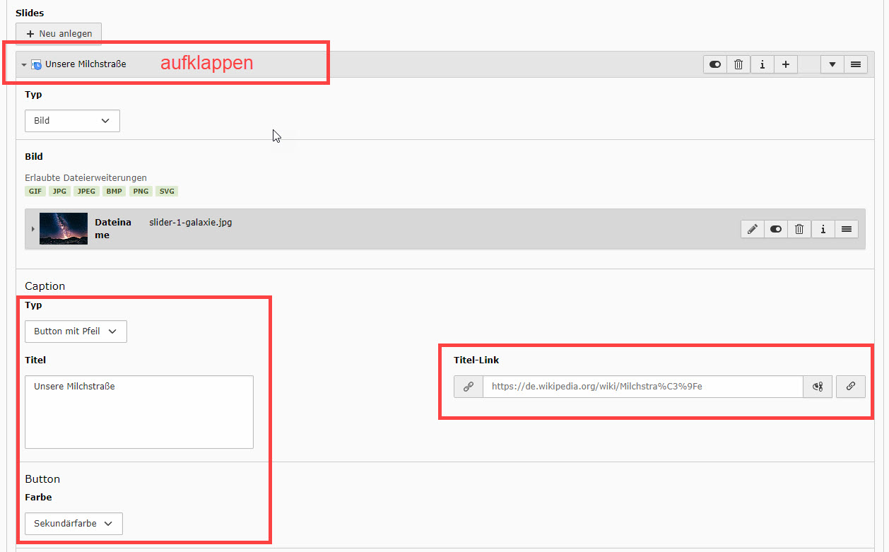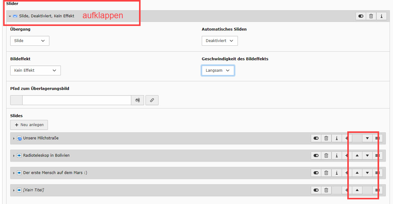 Abbildung 4: Über "+ Neu anlegen" dem Slider eine Slide hinzufügen