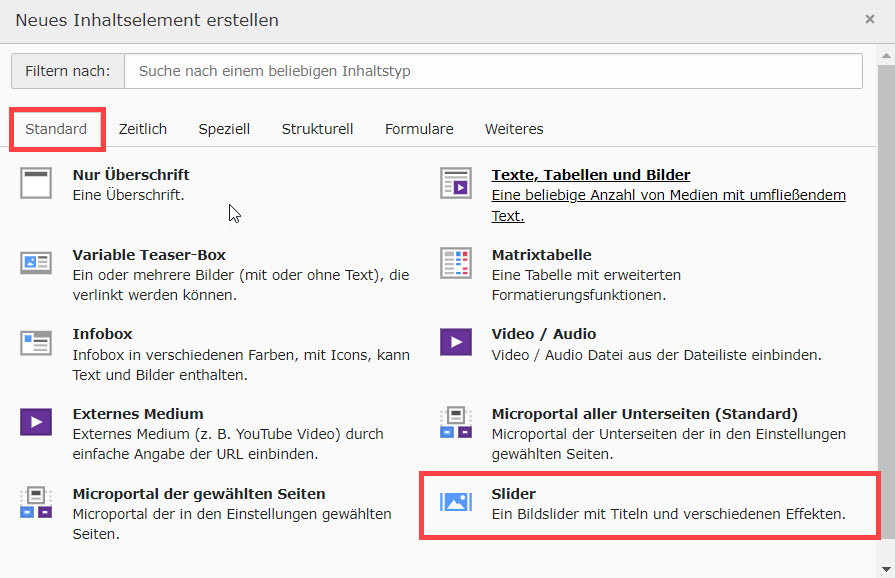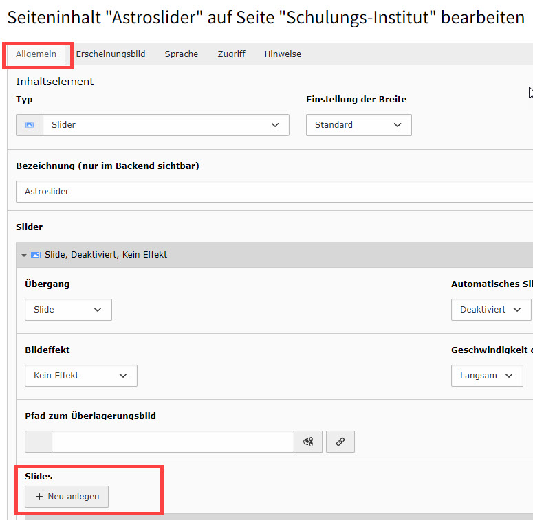 Abbildung 2: Inhaltselement "Slider" erstellen