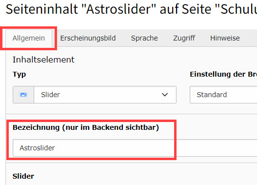 Abbildung 3: Slider zur besseren Orientierung eine Bezeichnung fürs Backend geben