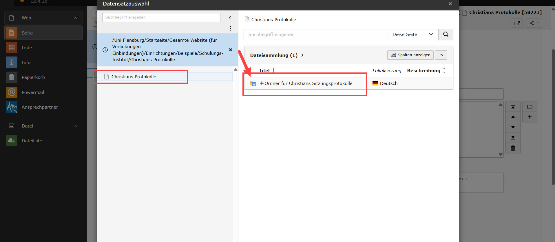 Abbildung 14: Passende Dateisammlung auswählen – wird dann mit dem Element „Dateilinks“ verknüpft