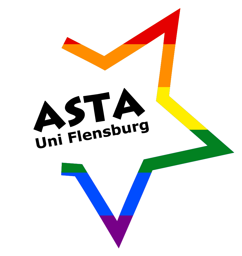 Das Bild zeigt das Logo des AStA der Europa-Universität Flensburg. Im Zentrum des Logo steht Aste uni Flensburg, umringt von einem angeschnittenen Stern in Regenbogenfarben.