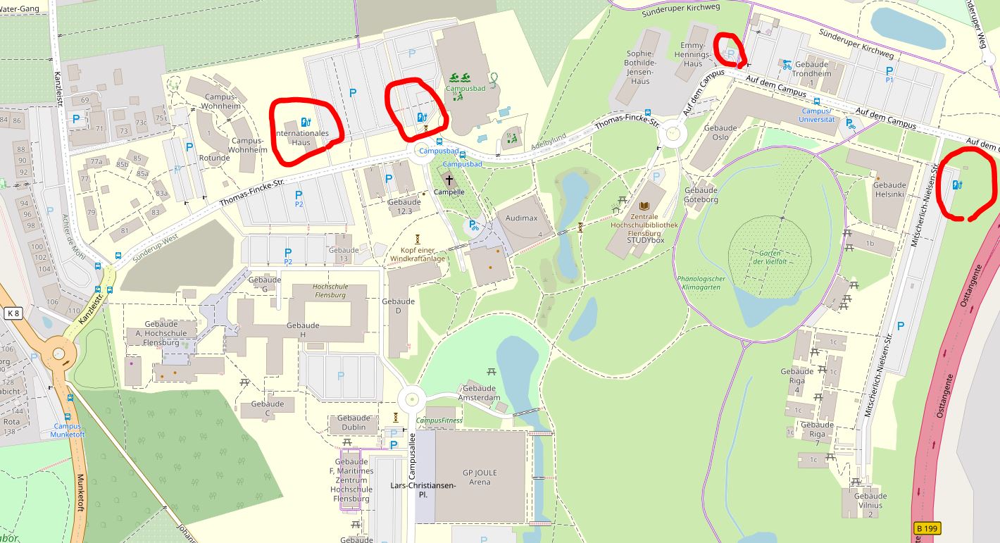 Diese Karte zeigt einen Ausschnitt der OpenStreetmap Karte auf dem Campus. Mit roten Markierungen sind Lademöglichkeiten für E-Fahrzeuge hervorgehoben.