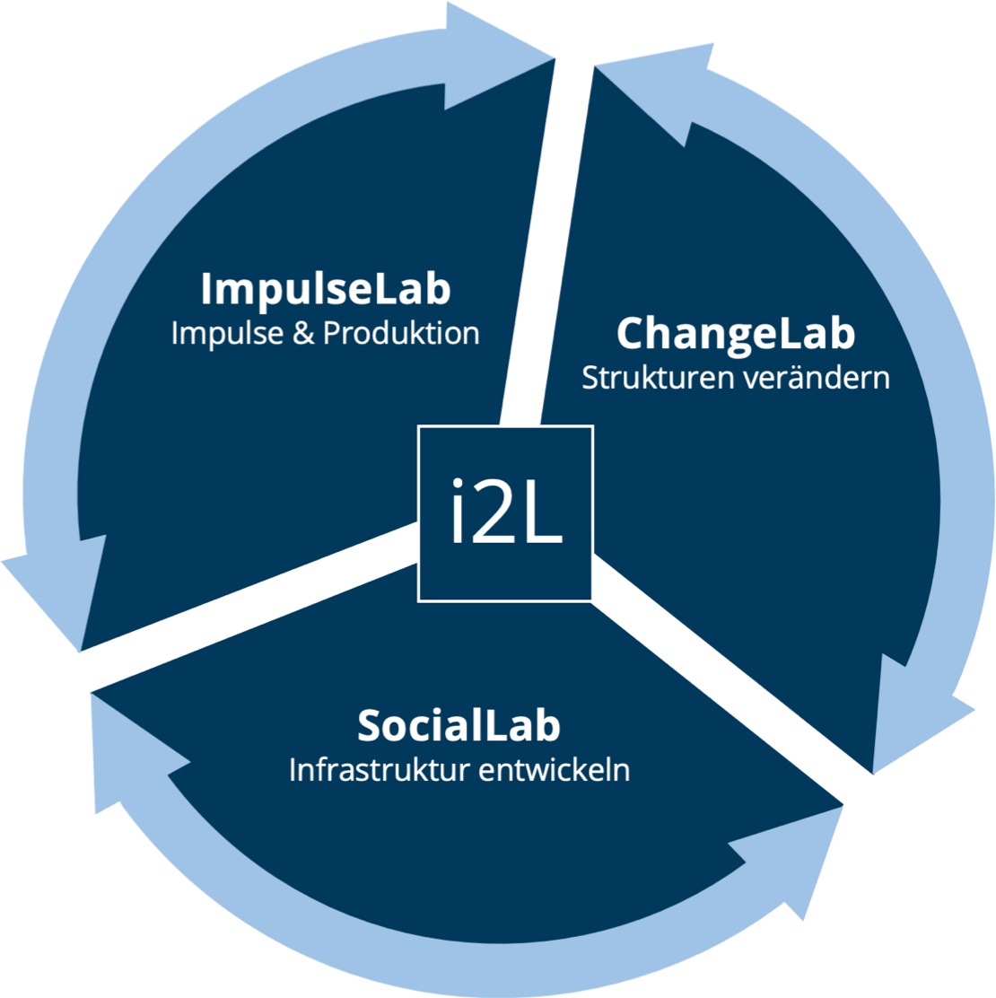 i2L – Geplante Angebote ImpulseLab, ChangeLab, SocialLab Innerhalb des i2L gibt es eine Aufgabenteilung hinsichtlich der Aspekte Wissenschaftlichkeit und Entwicklung (ImpulseLab), konkrete Rahmenbedin