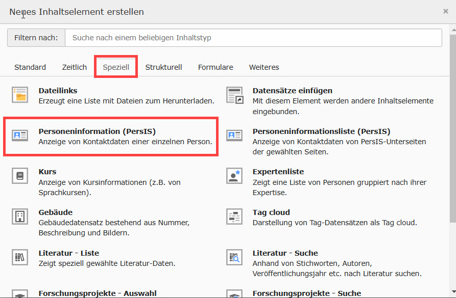 Abbildung 2: Element "Personeninformation (PersIS)" im Reiter „Speziell“ wählen
