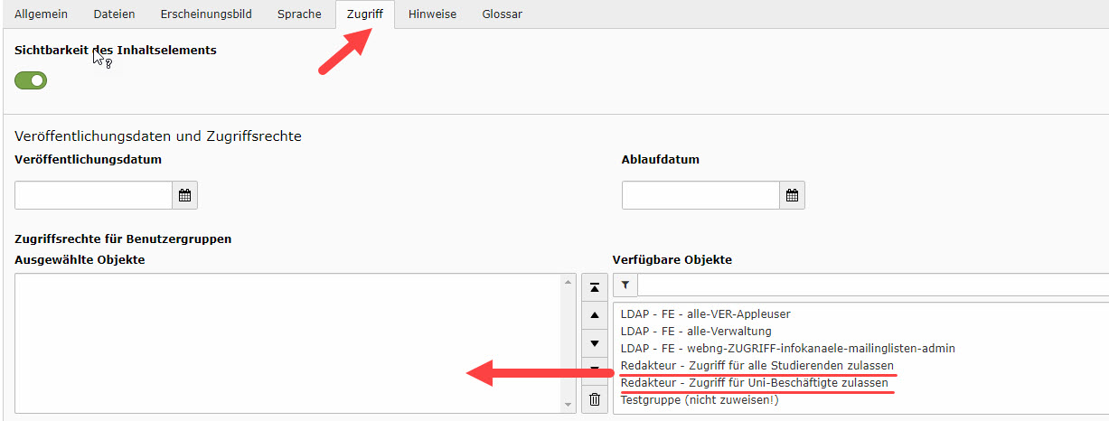Abbildung 6: Unter „Verfügbare Objekte“ die Gruppe wählen, die nach Anmeldung Zugriff erhalten soll, wandert durch Anklicken in die linke Spalte „Ausgewählte Objekte“