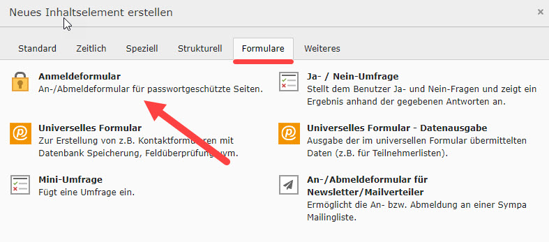 Abbildung 7: Auswahl des Inhaltselements "Anmeldeformular"