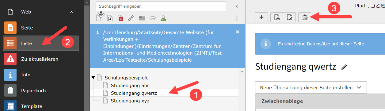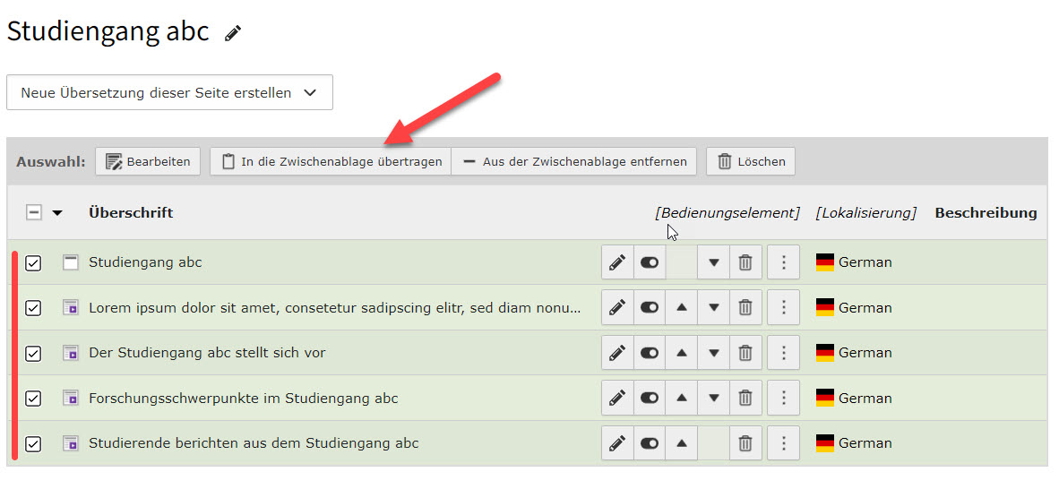 Abbildung 3: In der Tabelle „Seiteninhalt“ die zu kopierenden Elemente per Checkbox anwählen und mit dem Button „In die Zwischenablage übertragen“ kopieren