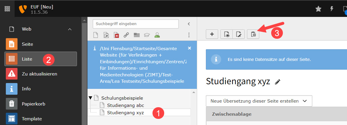 Abbildung 9: In der Tabelle „Seiteninhalt“ die zu verschiebenden Elemente per Checkbox anwählen und mit dem Button „In die Zwischenablage übertragen“ kopieren
