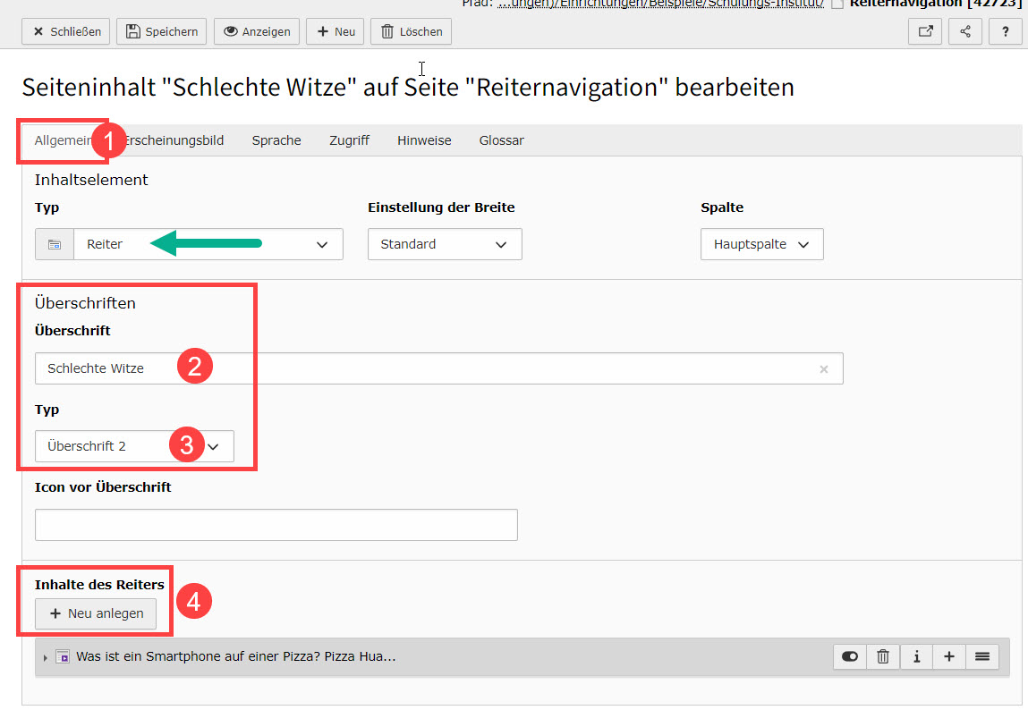 Abbildung 5: Reiter mit einer Überschrift versehen & Inhaltselement im Reiter anlegen