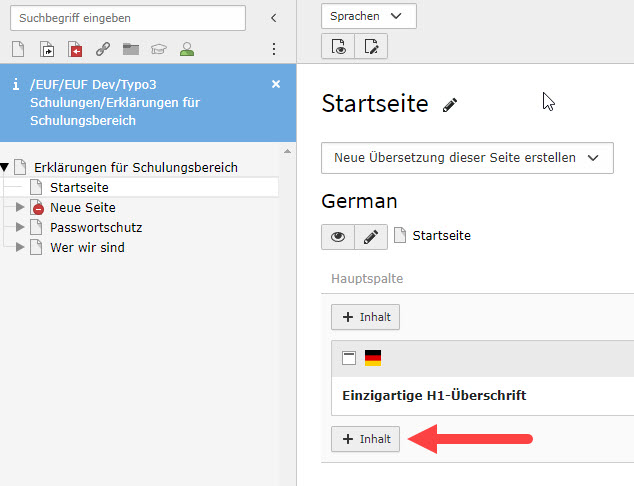 Abbildung 1: "+ Inhalt"-Button wählen, um ein neues Inhaltselement zu erzeugen