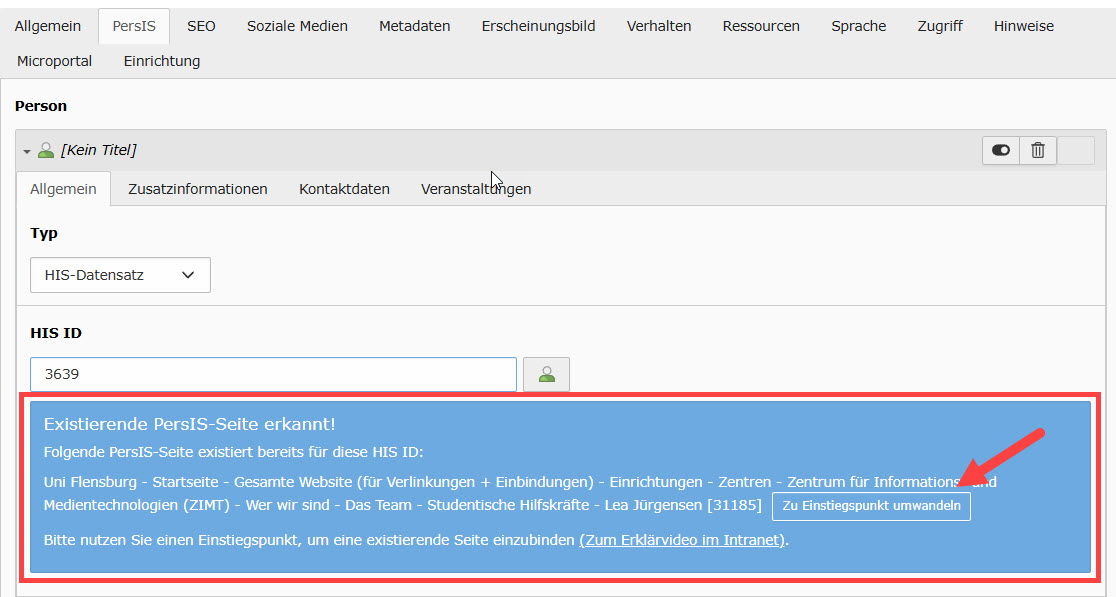 Abbildung 4: Warnung "Existierende PersIS-Seite erkannt!" und Umwandlung in einen Einstiegspunkt
