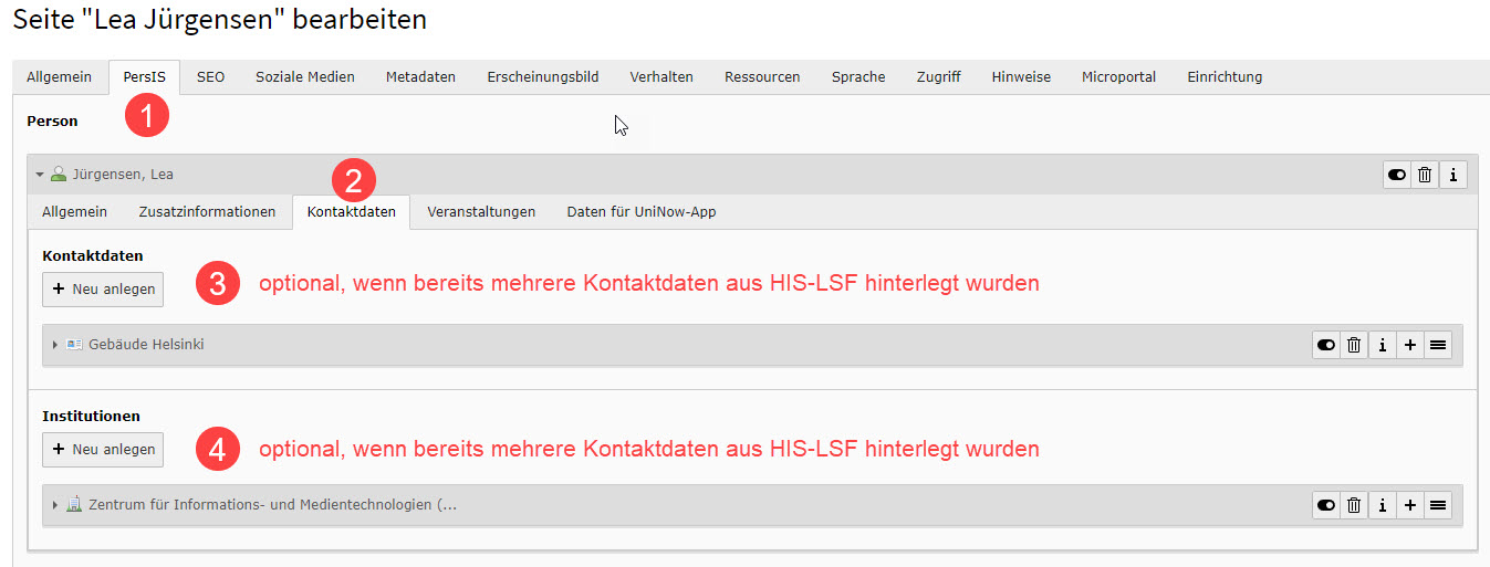 Abbildung 8: PersIS-Seite mit weiteren Inhaltselementen für z.B. Lebensläufe/Veröffentlichungslisten füllen