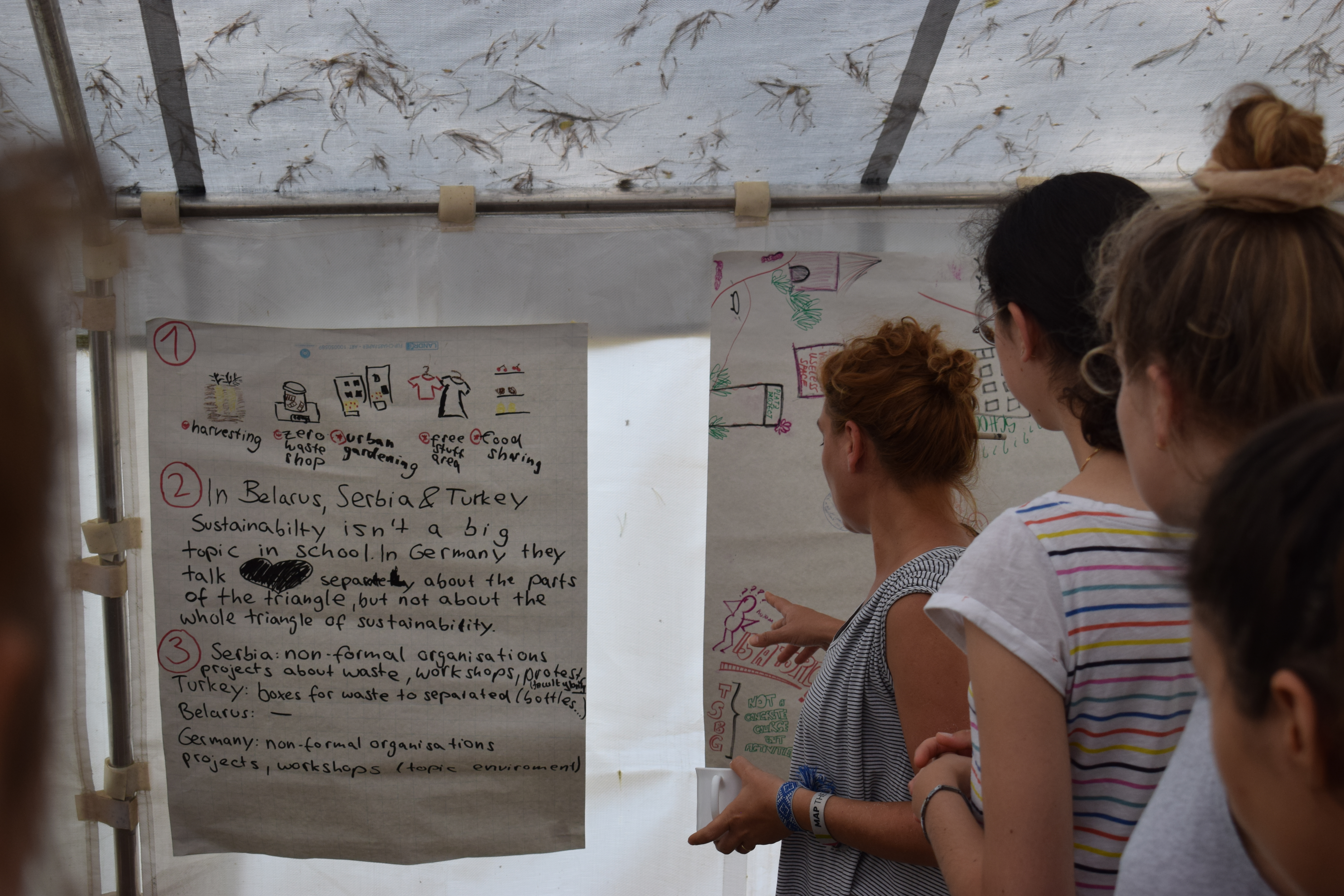 Das Foto zeigt eine internationale Gruppe bei der Konzeption des Planspiels "Ecotopia".