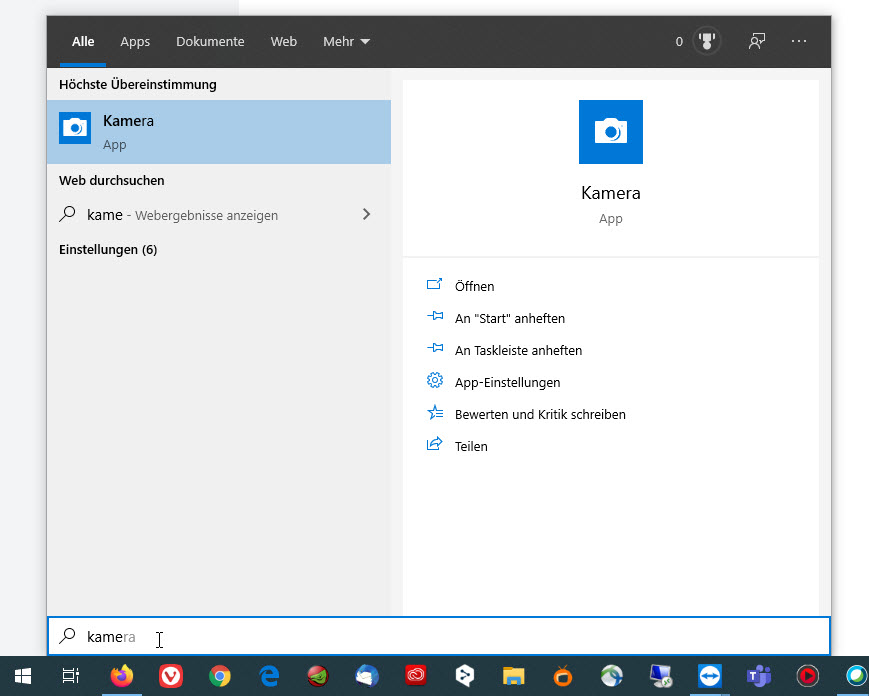 Screenshot 1: Drücken Sie die Windows-Taste und tippen Sie "Kamera" ein; Starten Sie dann die gefundene Windows-Kamera; Erscheint hier Ihr Bild, ist Ihre Kamera schonmal nicht defekt.