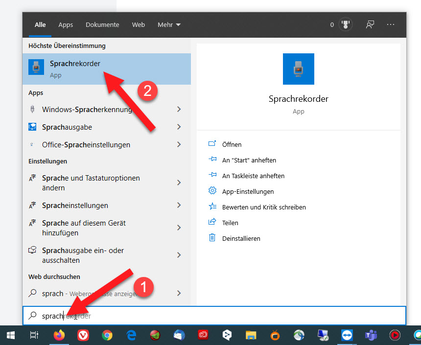Screenshot 1: Windows-Taste drücken und "Sprachrekorder" eintippen, dann das gefundene Windows-Tool starten