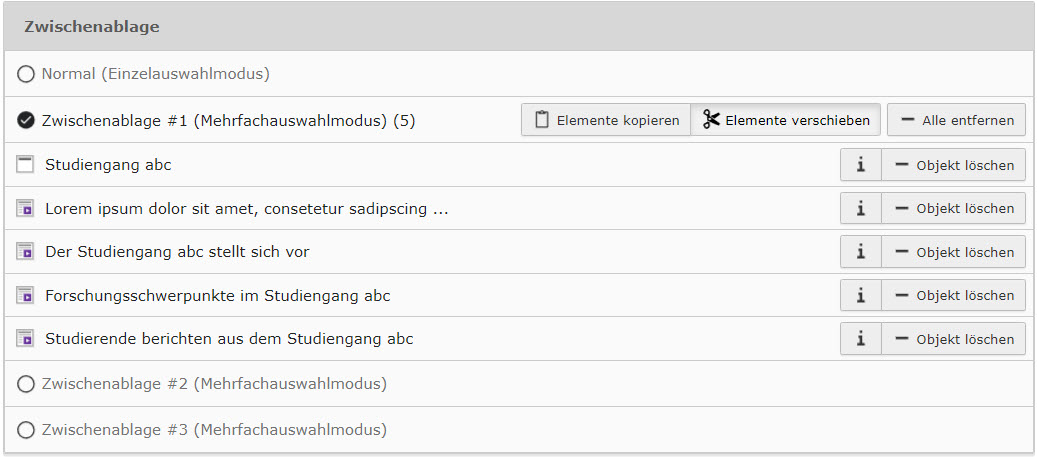 Abbildung 9: In der Tabelle „Seiteninhalt“ die zu verschiebenden Elemente per Checkbox anwählen und mit dem Button „In die Zwischenablage übertragen“ kopieren