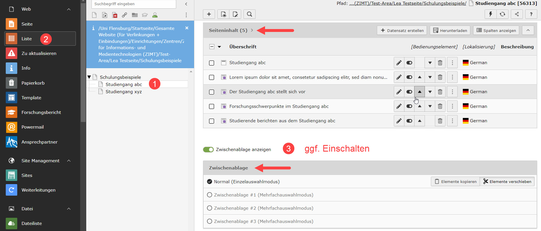 Abbildung 3: In der Tabelle „Seiteninhalt“ die zu kopierenden Elemente per Checkbox anwählen und mit dem Button „In die Zwischenablage übertragen“ kopieren