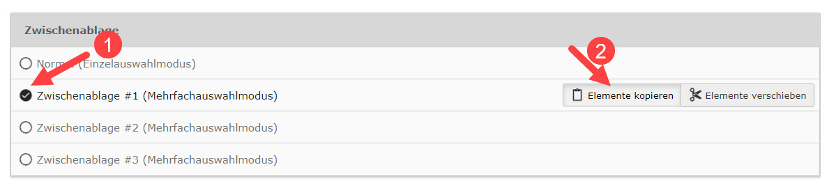 Abbildung 2: Mehrfachauswahlmodus in der Zwischenablage aktivieren und Funktion "Elemente kopieren" auswählen