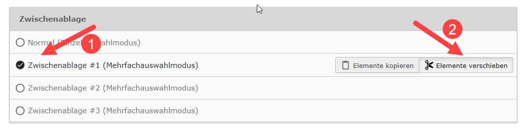 Abbildung 8: Mehrfachauswahlmodus in der Zwischenablage aktivieren und Funktion "Elemente verschieben" auswählen