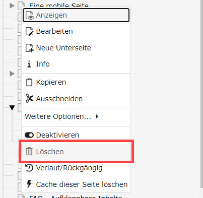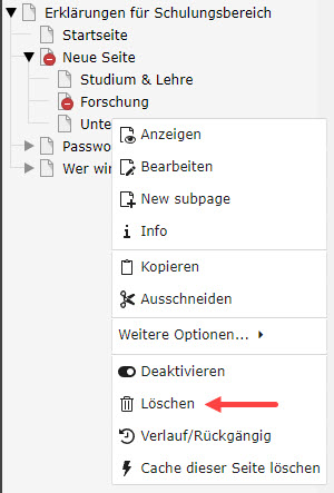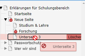 Abbildung 9: Über Rechtsklick öffnet sich ein kleines Seitenmenü, über welches sich die Seiten löschen lässt