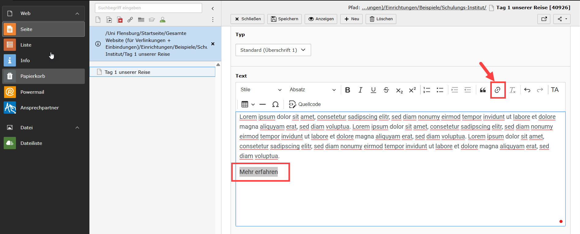 Abbildung 1: Text markieren und den Verlinken-Button wählen