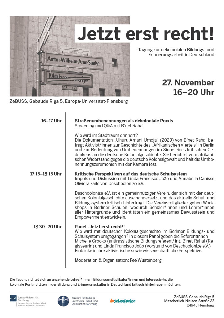Tagung „Jetzt erst recht!“ am 27. November 2025 von 16–20 Uhr im ZeBUSS (Gebäude Riga 5) Ein Nachmittag voller kritischer Perspektiven auf Bildung, Erinnerungskultur und koloniale Kontinuitäten in Deutschland