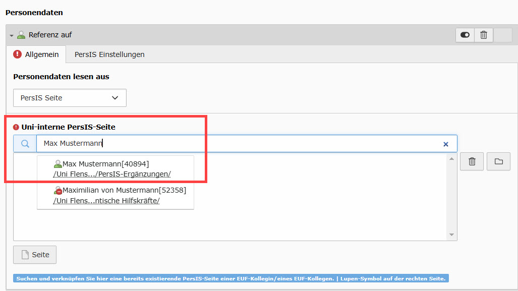 Abbildung 4: Referenz auf die PersIS-Seite für die Visitenkarte einrichten
