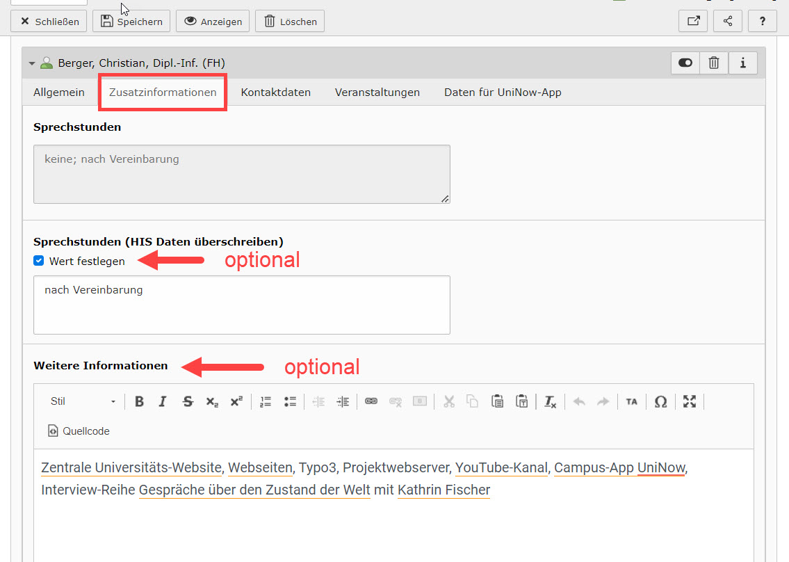 Abbildung 6: Bearbeiten der Zusatzinformationen der PersIS-Seite