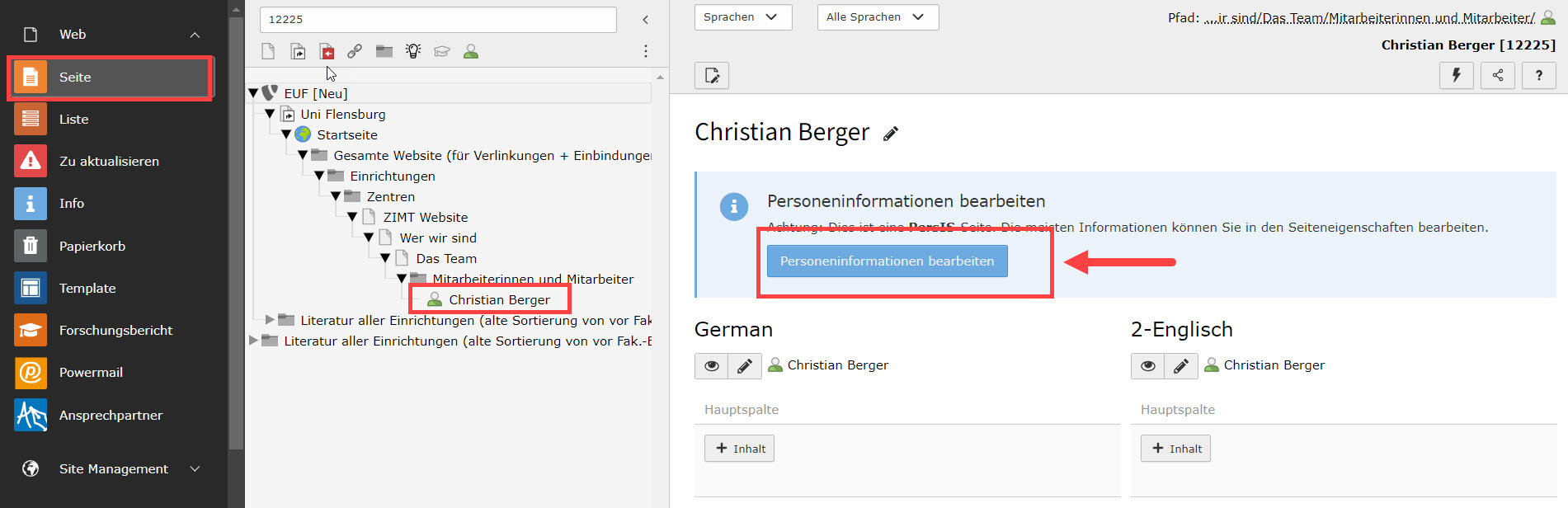 Abbildung 2: Aufrufen der Personeninformationen einer PersIS-Seite