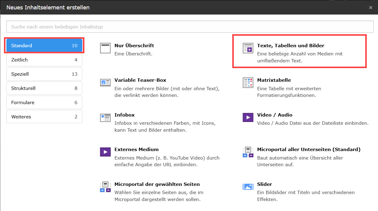Abbildung 2: Im Reiter "Standard" das Element "Texte, Tabellen und Bilder" wählen