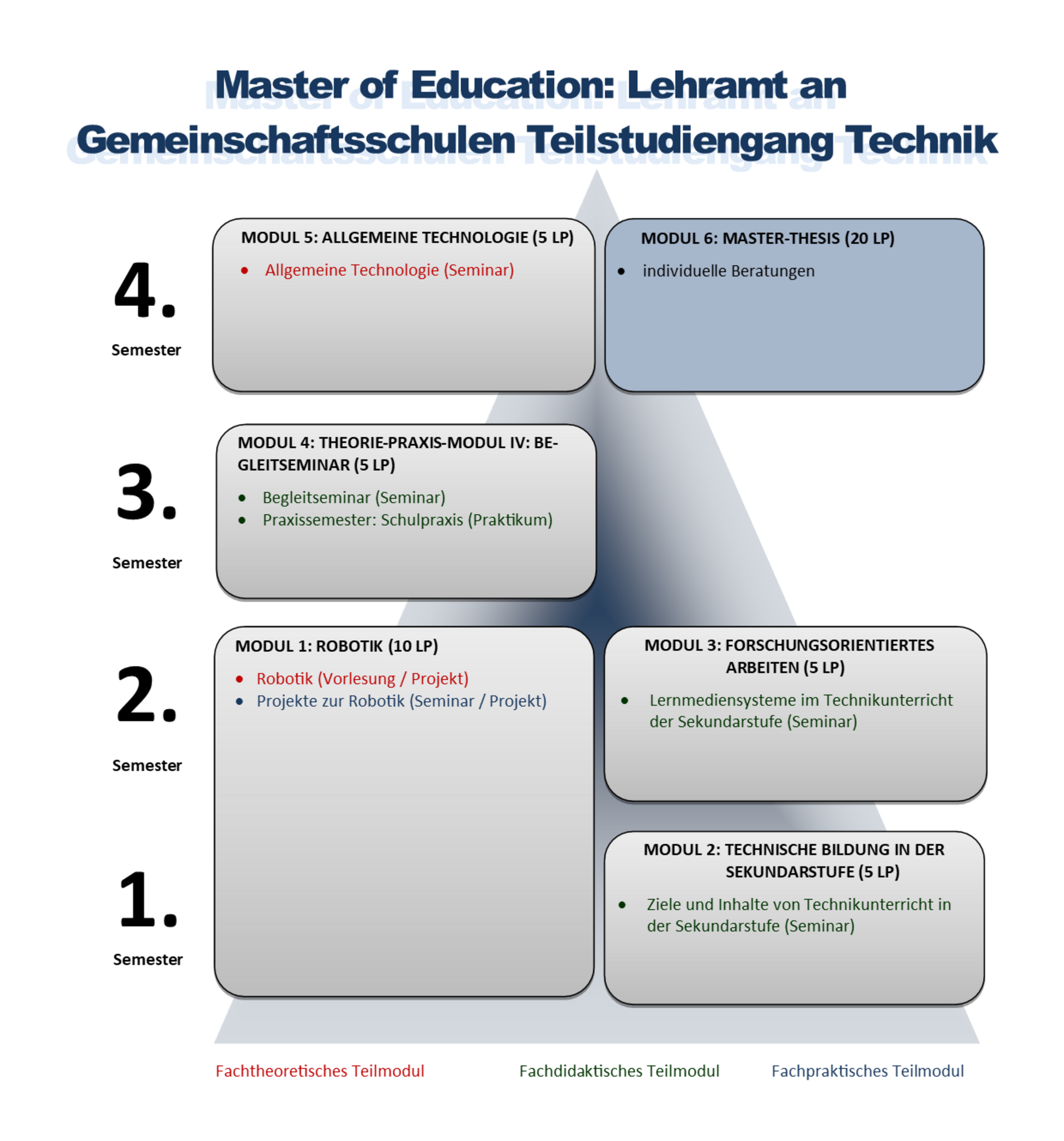 Die strukturierte Abfolge der Module stellt sicher, dass die Studierenden des Teilstudienganges Technik fachdidaktische und fachwissenschaftliche Kenntnisse sowie Fähigkeiten bzw. Fertigkeiten im Zusammenhang und im Fokus auf die Sekundarstufe erwerben können. Die Absolventinnen und Absolventen erwerben Fähigkeiten und Fertigkeiten, die hinsichtlich Wissen, Verstehen, Verwenden und Bewerten von technischen und technikwissenschaftlichen Inhalten in Theorie und Praxis deutlich über das Bachelor-Niveau hinausgehen.