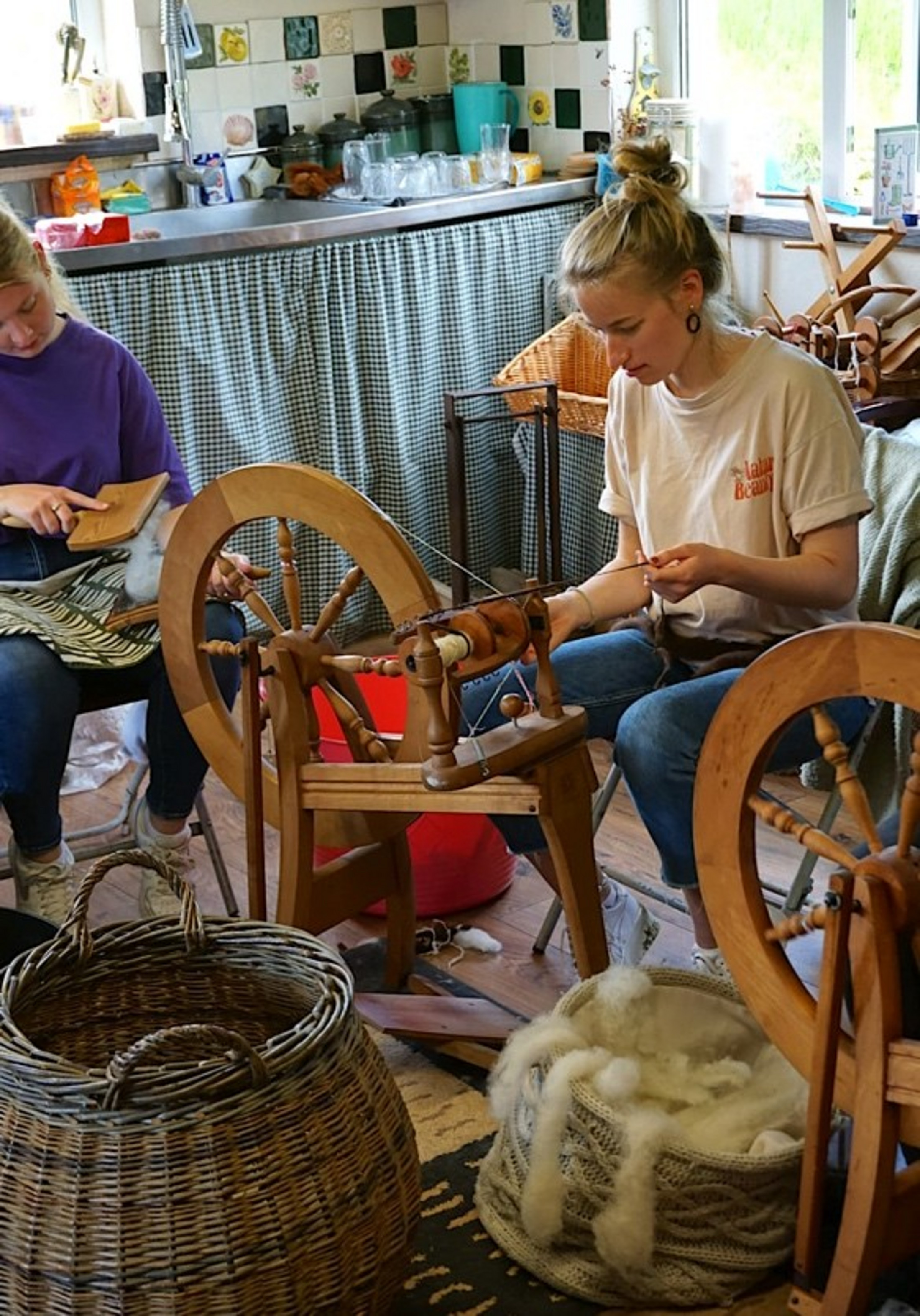 Exkursion des Färbergarten-M3-Kurses, Workshop bei Carina Coyne von „Joyce Country Wool“ in Finny, Co.Galway. Carina Coyne verarbeitet nur Wolle der eigenen Schafe bzw. von den Nachbarhöfen. Die Wolle färbt sie mit selbst gesammelten Färberpflanzen und Flechten vom eigenen Hof. Diese wird kardiert, versponnen und weiterverarbeitet (verstrickt oder verwebt).
