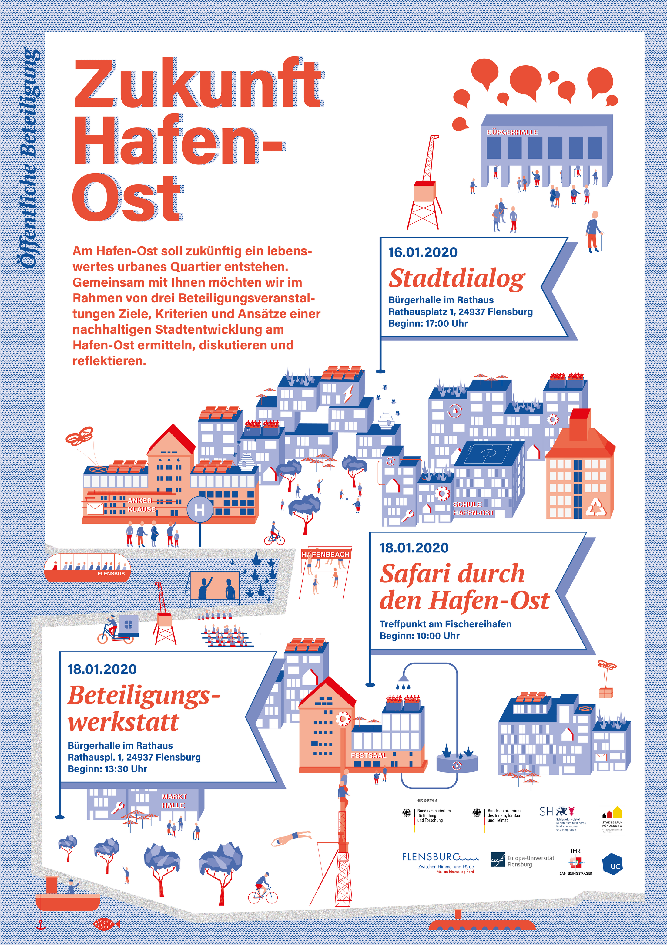 Am Nachmittag des 18.01.2020 können Sievon 13.30-17.15 Uhr in einer Beteiligungswerkstatt in der Bürgerhalle des Rathauses eigene Ideen für ein lebendiges, urbanes und nachhaltiges Hafenquartier entwickeln.