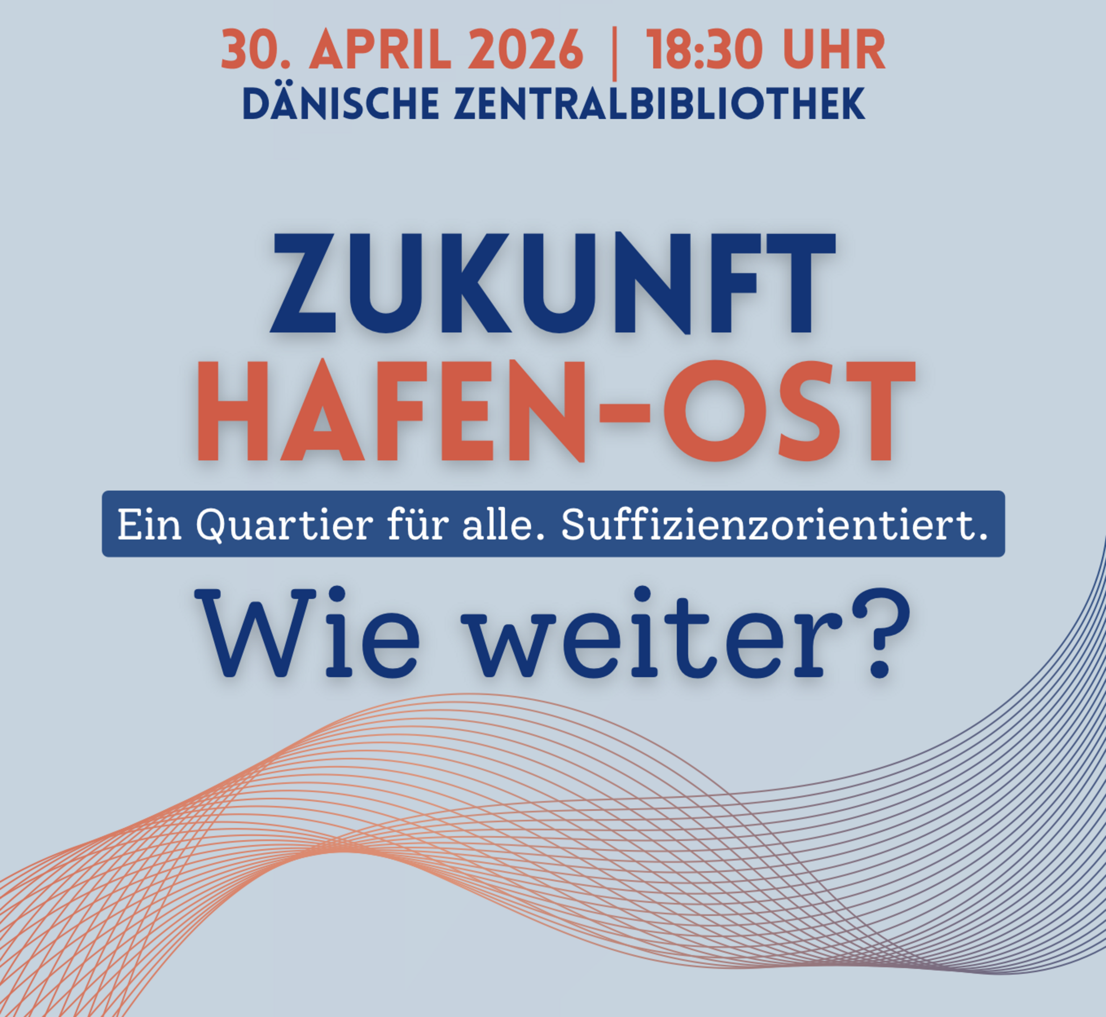 Diese Fragen wollen wir gemeinsam mit Vertreter:innen aus Politik, Verwaltung, Planung, Wissenschaft sowie interessierten Flensburger*innen diskutieren. Ziel ist es, Transparenz über den aktuellen Stand zu schaffen, offene Punkte zu klären und einen konstruktiven Austausch darüber anzustoßen, wie Hafen-Ost und die Stadtentwicklung Flensburgs insgesamt den Anspruch einer sozial-ökologischen Transformation weitertragen können.