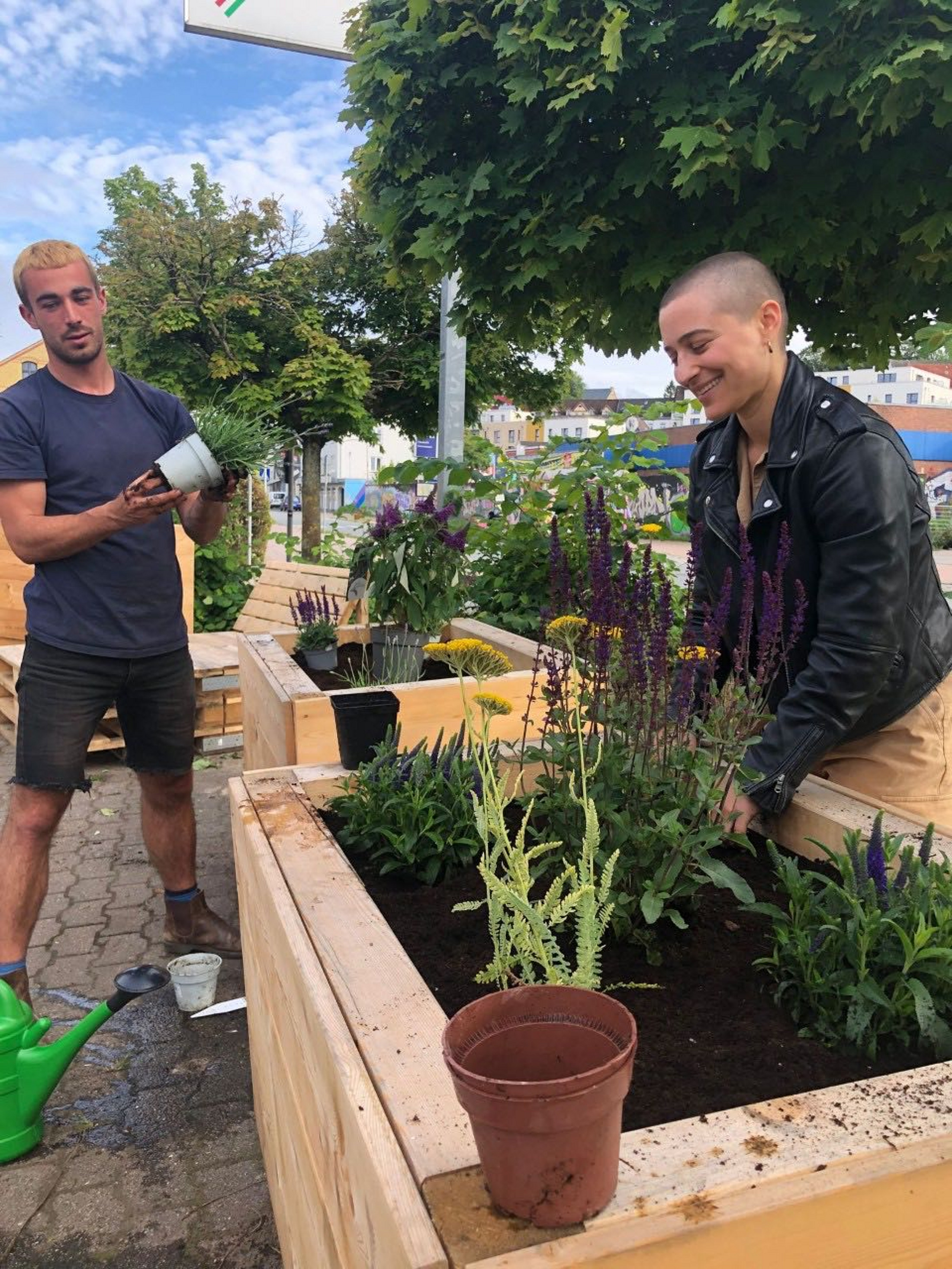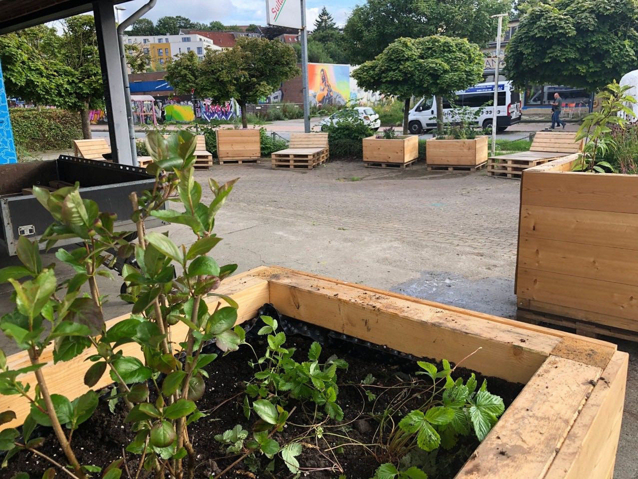 Durch eine gemeinschaftliche Aufbau- und Bepflanzungsaktion verwandelte sich der Vorplatz des Ex-Sultanmarkts von einem ungenutzten Parkplatz in einen grünen, aktiv nutzbaren Ort der Begegnung. Seitdem ist der Sultangarten ein beliebter Pausen-, Treff- und Aufenthaltsort. Sowohl für die Besucher*innen des Ex-Sultanmarkts als auch für die Bewohner*innen der Flensburger Neustadt.