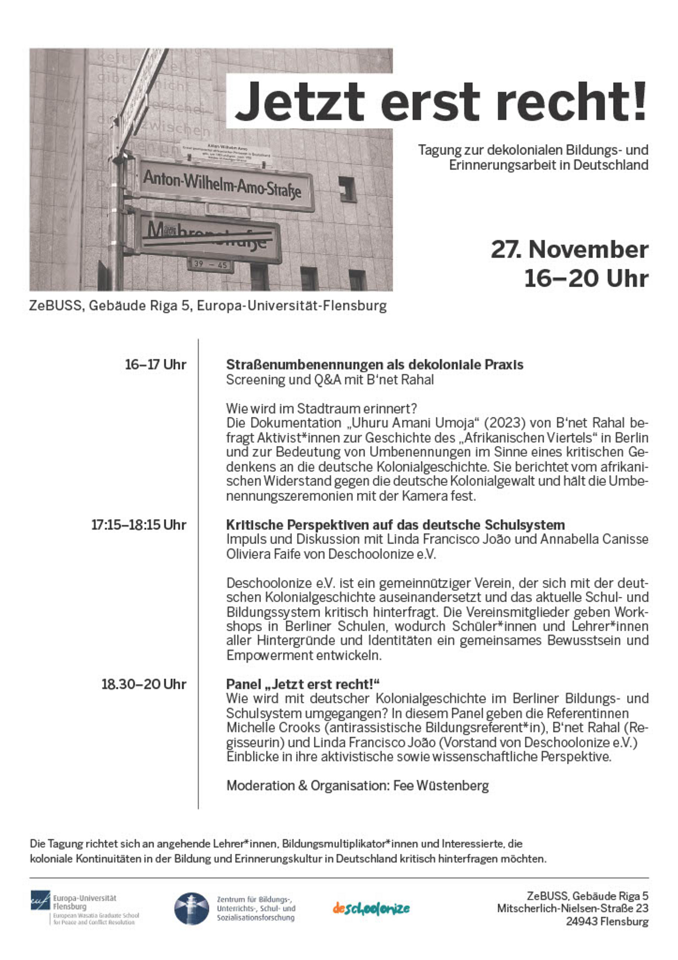 Ein Nachmittag voller kritischer Perspektiven auf Bildung, Erinnerungskultur und koloniale Kontinuitäten in Deutschland. Gemeinsam mit Aktivistinnen, Wissenschaftlerinnen und Filmschaffenden wollen wir fragen, wie (post)koloniale Machtverhältnisse in Schule und Stadt sichtbar bleiben – und wie wir sie gemeinsam verlernen können.