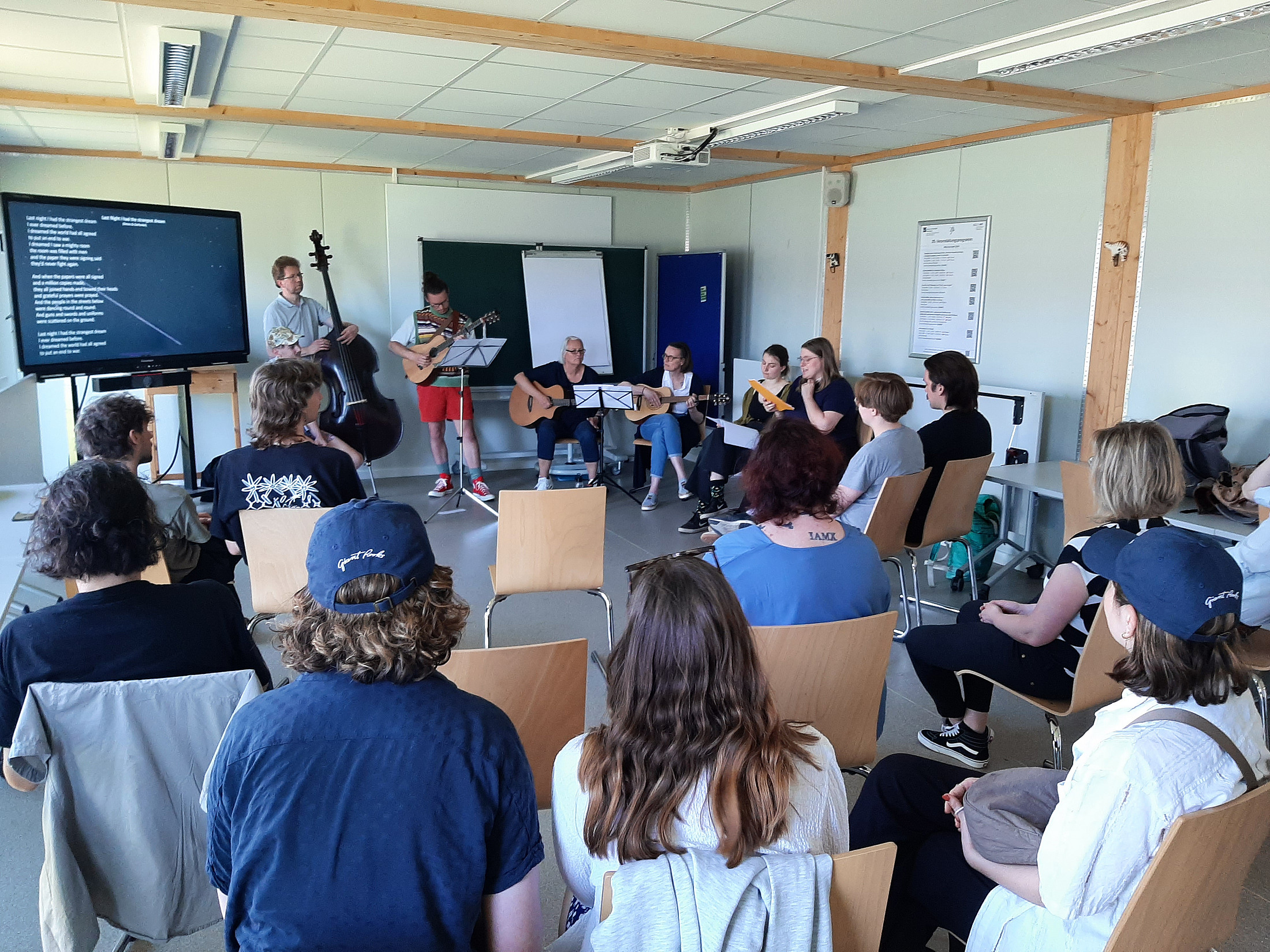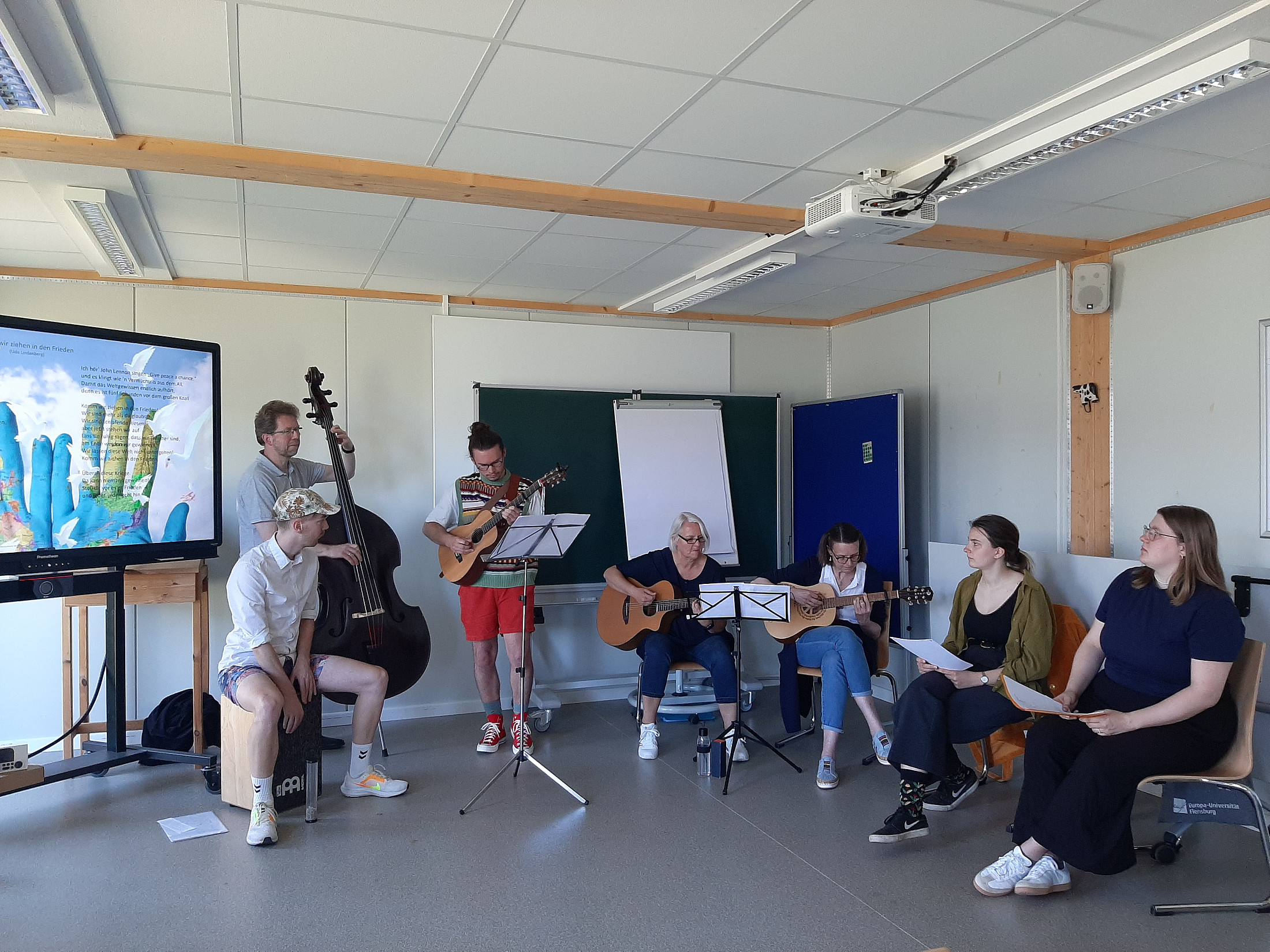 Im Rahmen der Europawoche an der EUF fand am 16.05.2024 in den Räumlichkeiten des ZfL eine musikalische Mittagspause statt. Gemeinsam mit der Abteilung Musik wurde das Thema "Songs about peace and making a better world" musikalisch umgesetzt und zum Zuhören und Mitsingen eingeladen. Dieses Angebot wurde von den zahlreichen Besuchern gerne angenommen.
