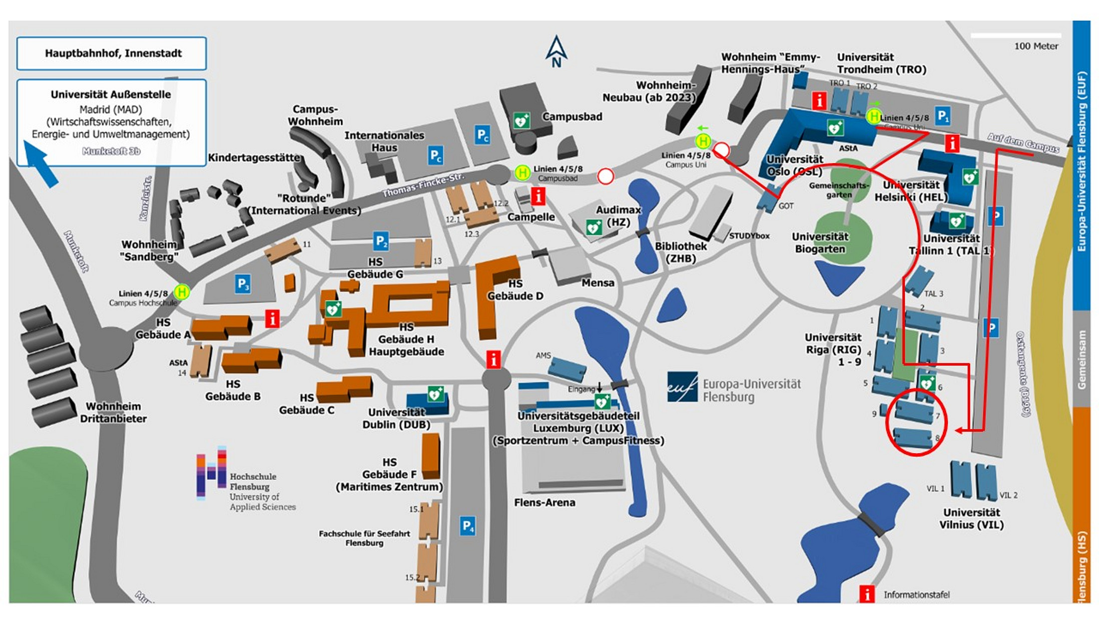 Über folgenden Link erhalten Sie Informationen zur Anfahrt mit dem ÖPNV: https://www.uni-flensburg.de/die-universitaet/unser-hochschulcampus/auf-den-campus-kommen-anfahrt#c122190. Planen Sie für den Fußweg von der Bushaltestelle "Campus Uni" zum Modulbau RIG8 ungefähr 7 Minuten Fußweg ein.