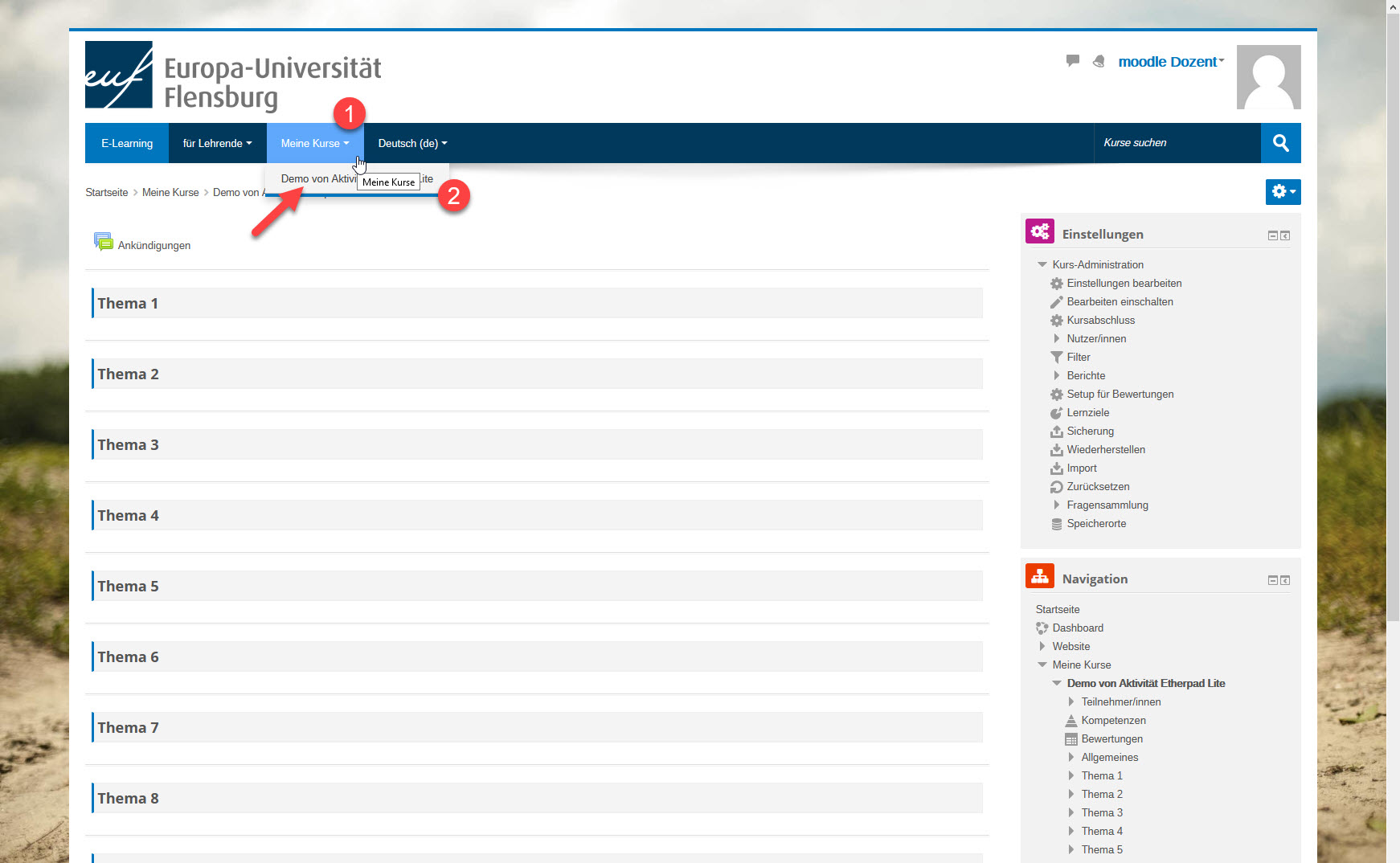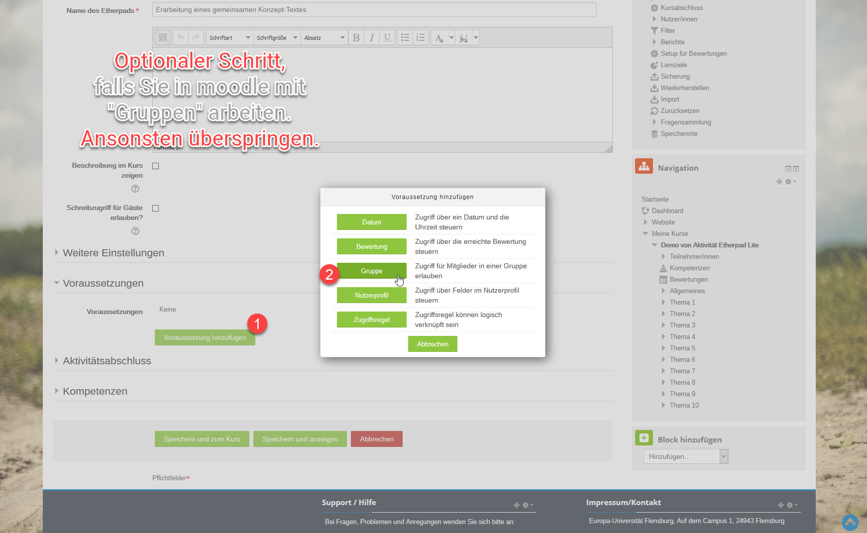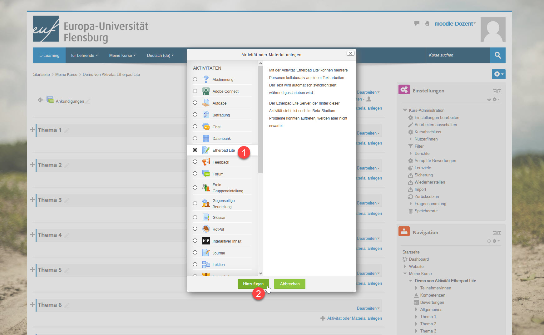 - Die Löschung einer Aktivität "Etherpad lite" löscht zugleich unwiderruflich den Inhalt des zugehörigen Etherpads.