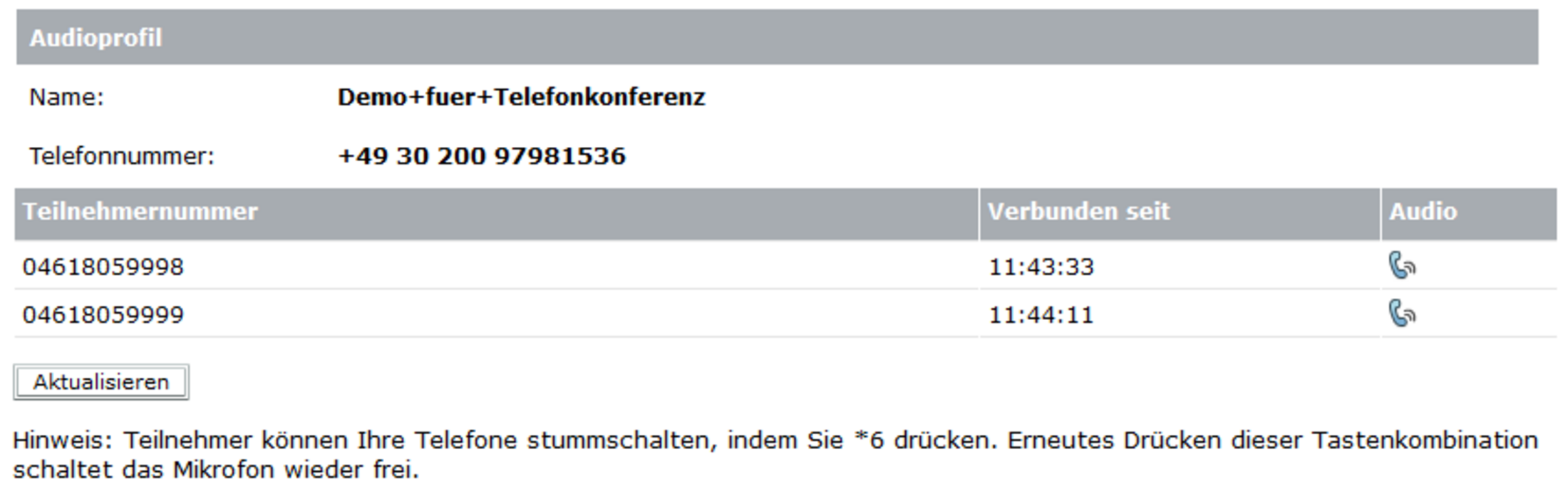 Hinweis: Teilnehmer können Ihre Telefone stummschalten, indem Sie *6 drücken. Erneutes Drücken dieser Tastenkombination schaltet das Mikrofon wieder frei.