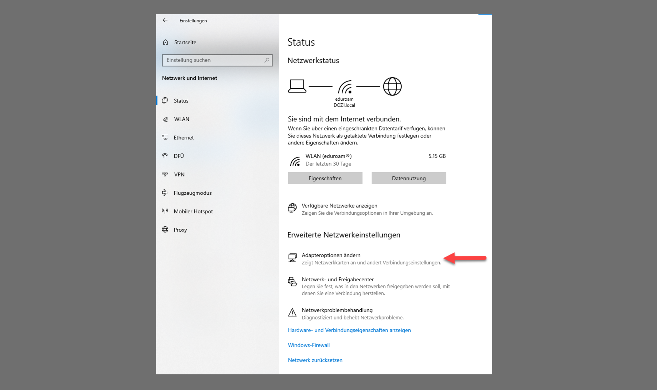 Klicken Sie in den Einstellungen > Netzwerk und Internet auf Status. Klicken Sie dann auf den Knopf “Eigenschaften” unterhalb von eduroam. Prüfen Sie, dass (wie im Screenshot (Abb. 1) markiert):