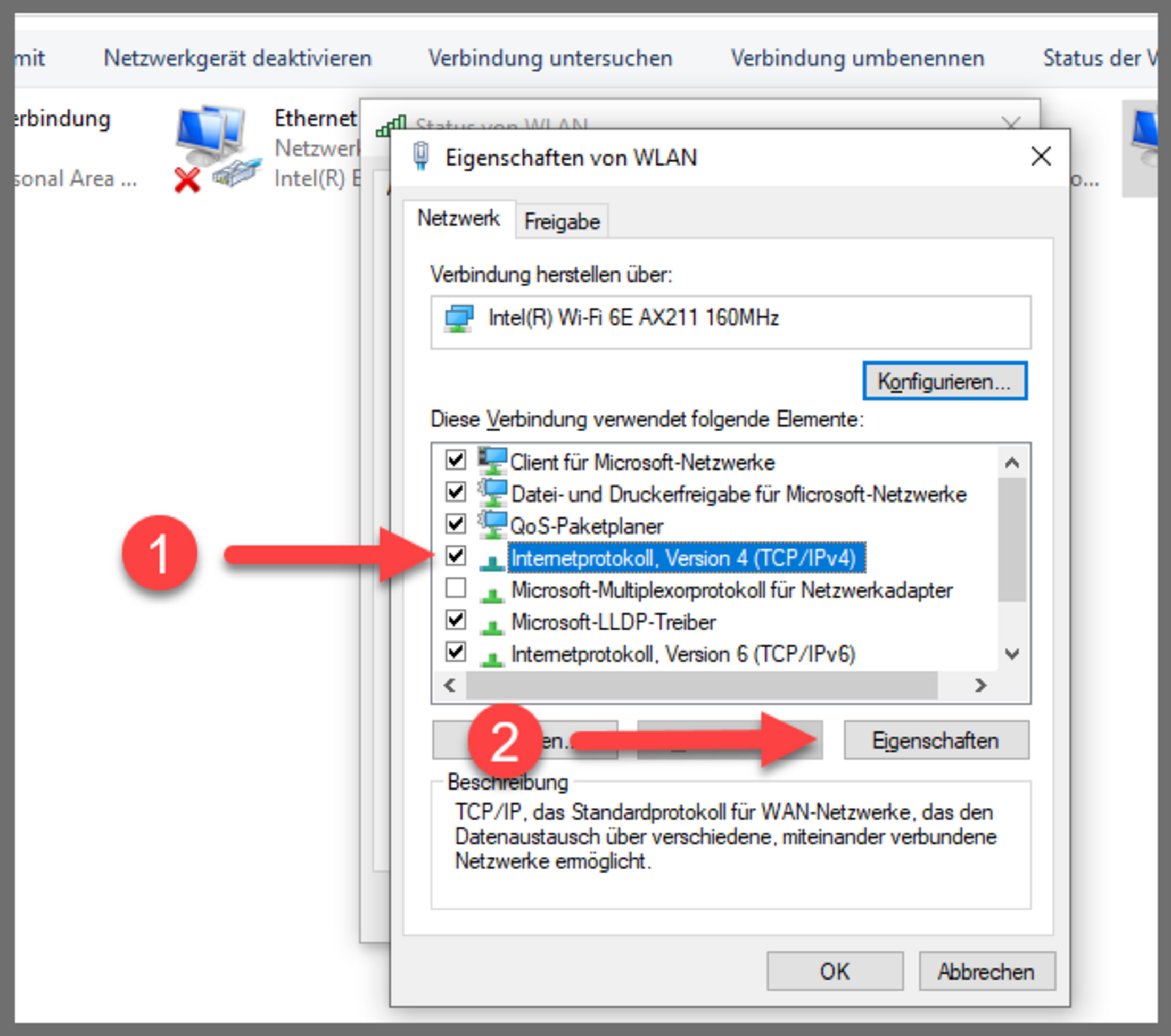 Klicken Sie auf “Internetprotokoll, Version 4 (TCP/IPv4)”. Unten ist der vorherig ausgegraute Knopf “Eigenschaften” nun anklickbar.