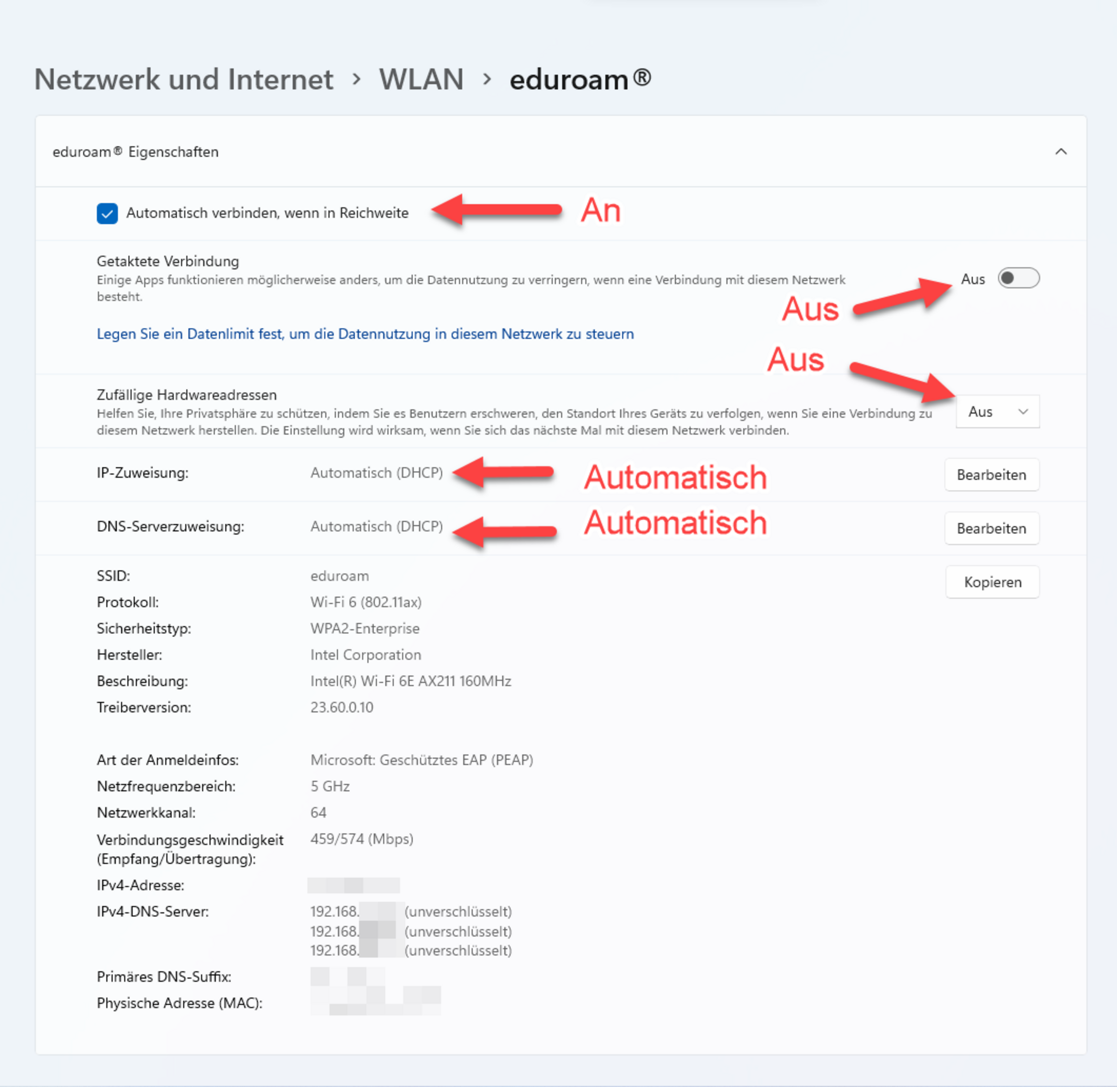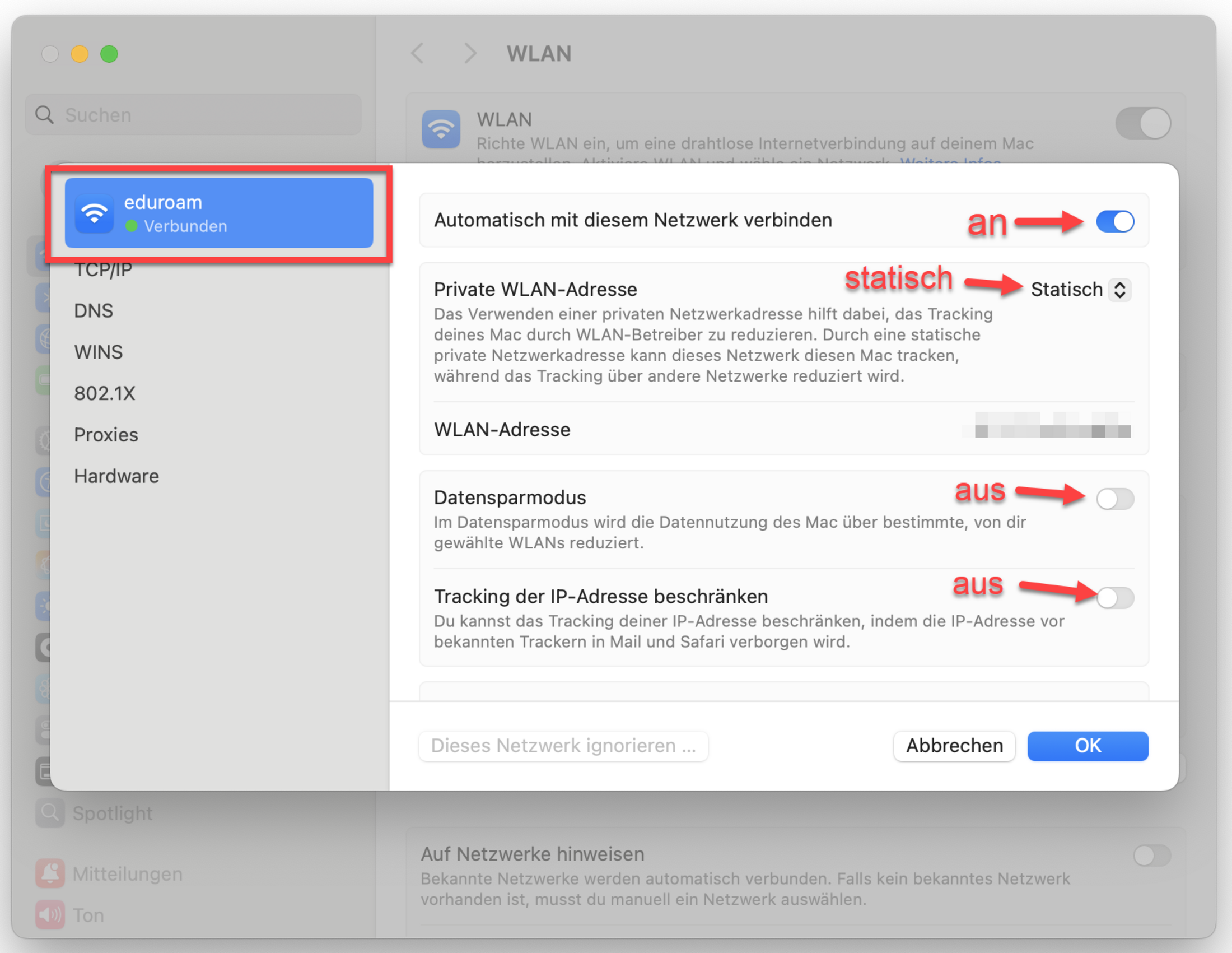 - Private WLAN-Adresse Aus