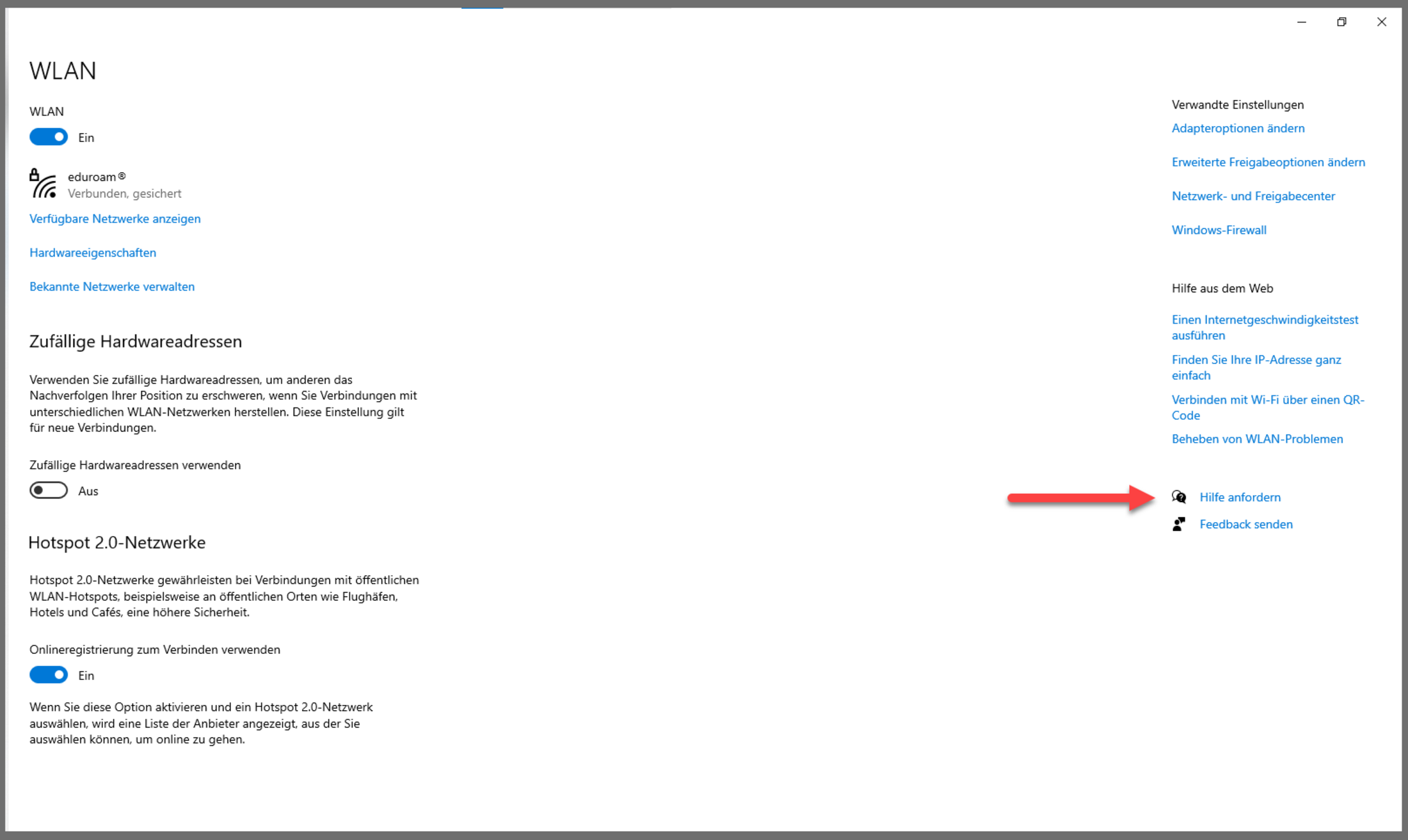 Führen Sie bitte die Netzwerk-Problembehandlung durch. Klicken Sie dafür in den Netzwerkeinstellungen auf “Hilfe Anfordern”. Achten Sie besonders darauf, dass Sie: