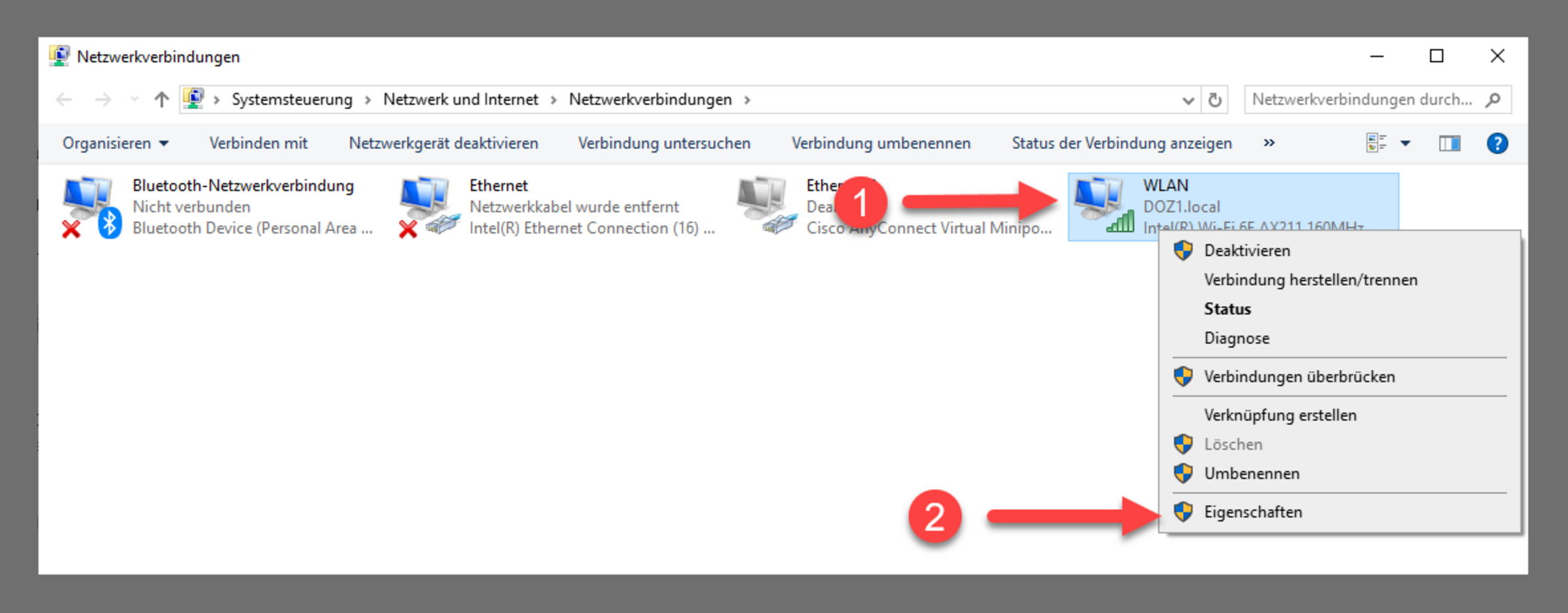 Rechtsklicken Sie auf “WLAN”. Drücken Sie auf “Eigenschaften”.
